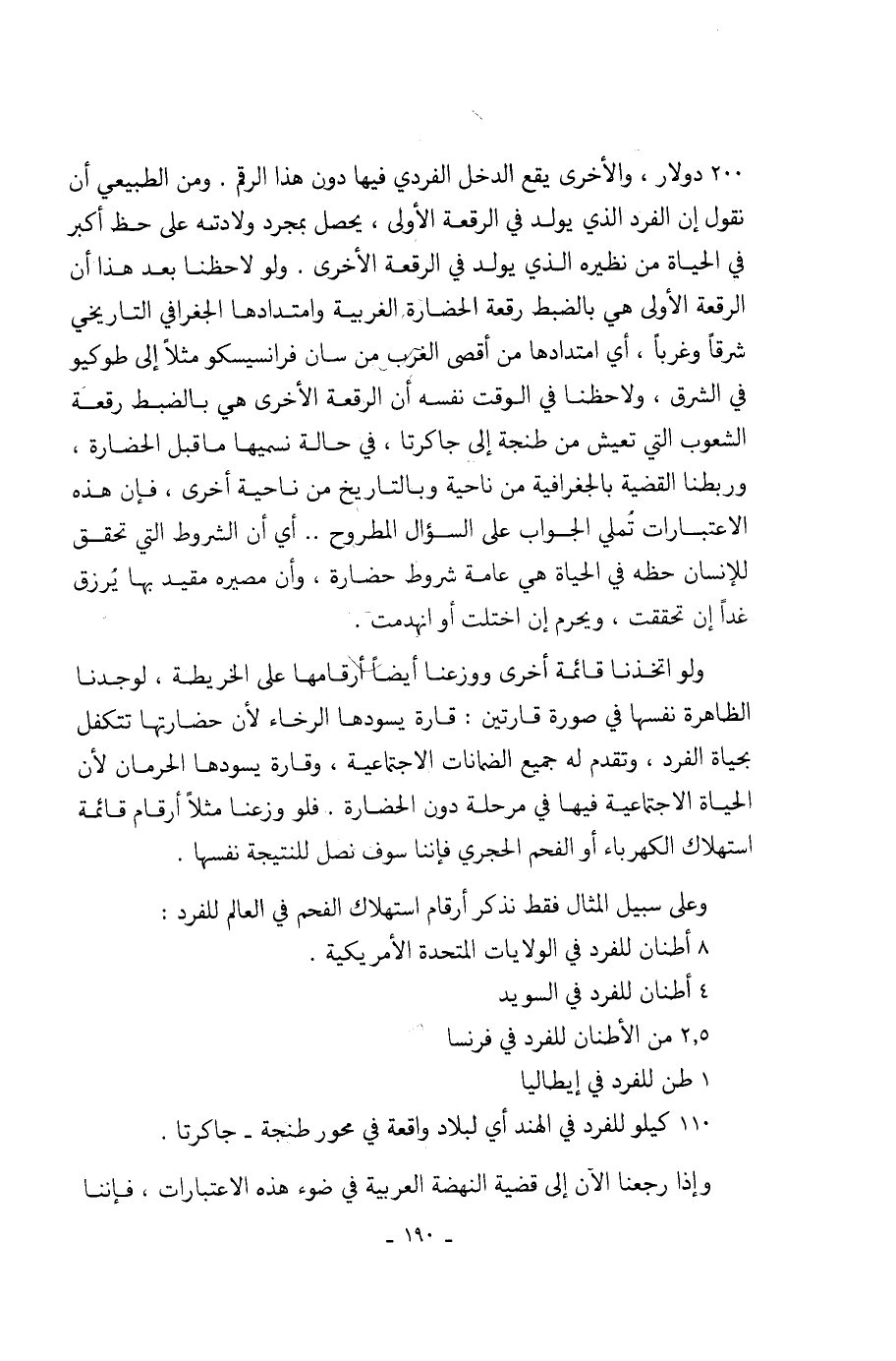 200 دولار، والأخرى يقع الدخل الفردي فيها دون هذا الرقم. ومن الطبيعي أن نقول إن الفرد الذي يولد في الرقعة الأولى، يحصل بمجرد ولادته على حظ أكبر في الحياة من نظيره الذي يولد في الرقعة الأخرى. ولو لاحظنا بعد هذا أن الرقعة الأولى هي بالضبط رقعة الحضارة الغربية وامتدادها الجغرافي التاريخي شرقاً وغرباً، أي امتدادها من أقصى الغرب من سان فرانسيسكو مثلاً إلى طوكيو في الشرق، ولاحظنا في الوقت نفسه أن الرقعة الأخرى هي بالضبط رقعة الشعوب التي تعيش من طنجة إلى جاكرتا، في حالة نسميها ما قبل الحضارة، وربطنا القضية بالجغرافية من ناحية وبالتاريخ من ناحية أخرى، فإن هذه الاعتبارات تُملي الجواب على السؤال المطروح .. أي أن الشروط التي تحقق للإنسان حظه في الحياة هي عامة شروط حضارة، وأن مصيره مقيد بها يُرزق غداً إنما تحققت، ويحرم إن اختلت أو انهدمت.