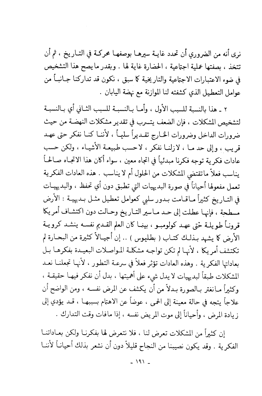 2 - هذا بالنسبة للسبب الأول، وأما بالنسبة للسبب الثاني أي بالنسبة لتشخيص المشكلات، فإن الضعف يتسرب في تقدير مشكلات النهضة من حيث ضرورات الداخل وضرورات الخارج تقديراً سليما، لأننا كنا نفكر حتى عهد قريب، وإلى حد ما، لازلنا نفكر، لا حسب طبيعة الأشياء، ولكن حسب عادات فكرية توجه فكرنا مبدئياً في اتجاه معين، سواء أكان هذا الاتجاه صالحاً يناسب فعلا ما تقتضي المشكلات من الحلول أم لا يناسب. هذه العادات الفكرية تعمل مفعولها أحياناً في صورة البديهيات التي تطبق دون أي تحفظ، والبديهيات في التاريخ كثيراً ما قامت بدور سلبي كعوامل تعطيل مثل بديهية: الأرض مسطحة، فإنها عطلت إلى حد ما سير التاريخ وحالت دون اكتشاف أمريكا قروناً طويلة حتى عهد كولومبو، بينما كان العلم القديم نفسه ينشد كروية الأرض كما يشهد بذلك كتاب (بطليموس) .. إن أجيالاً كثيرة من البحارة لم تكتشف أمريكا، لأنها لم تكن تواجه مشكلة المواصلات البعيدة بفكرها بل بعاداتها الفكرية. وهذه العادات تؤثر فعلاً في سرعة التطور، لأنها تجعلنا نعد المشكلات طبقاً لبديهيات لا يدل شيء على أهميتها، بدل أن نفكر فيها حقيقة، وكثيراً ما نغتر بالصورة بدلاً من أن يكشف عن المرض نفسه، ومن الواضح أن علاجاً يتجه في حالة معينة إلى الحمى، عوضاً عن الاهتمام بسببها، قد يؤدي إلى زيادة المرض، وأحياناً إلى موت المريض نفسه، إذا ما فات وقت التدارك.