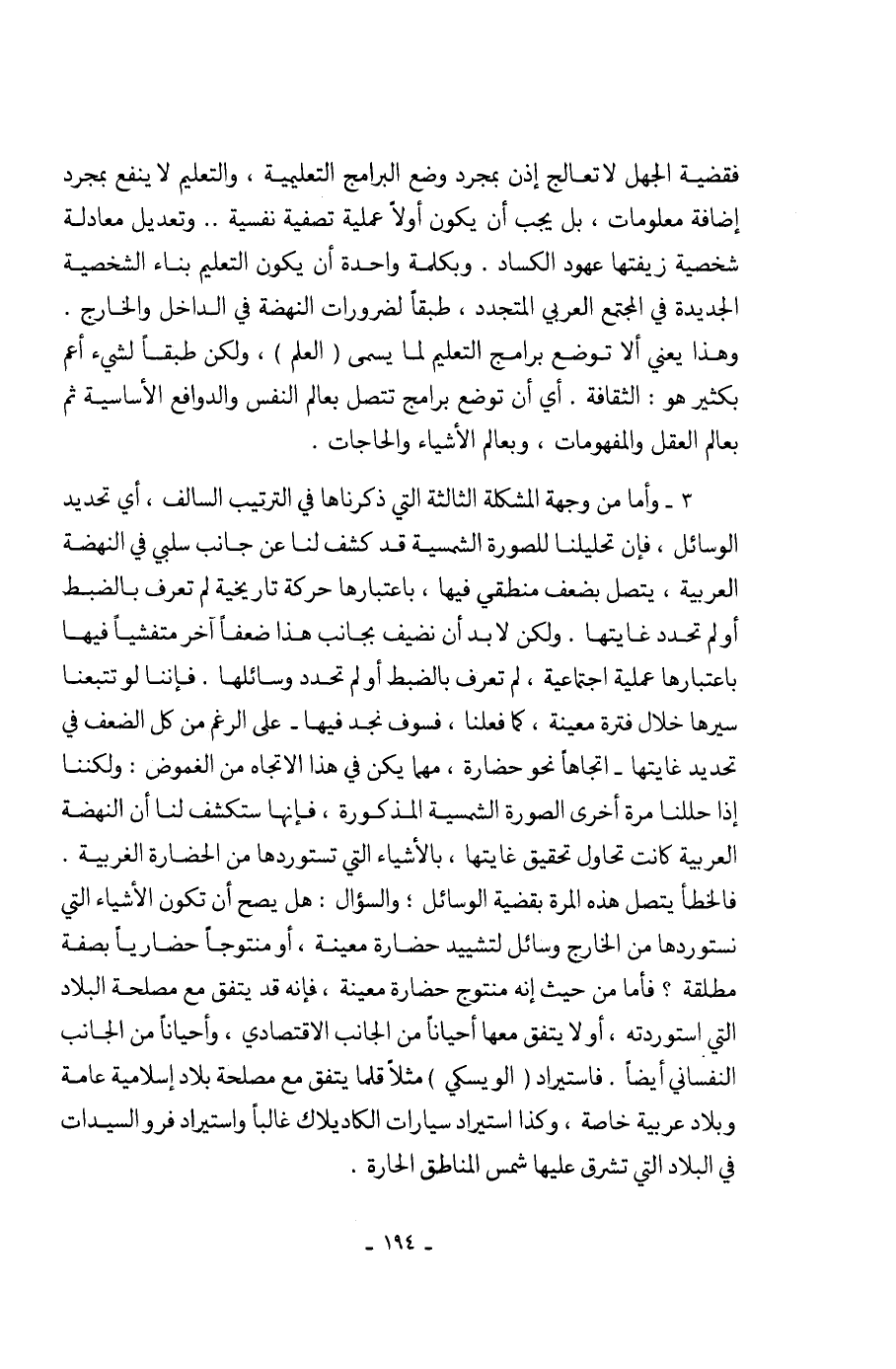 3 - وأما من وجهة المشكلة الثالثة التي ذكرناها في الترتيب السالف، أي تحديد الوسائل، فإن تحليلنا للصورة الشمسية قد كشف لنا عن جانب سلبي في النهضة العربية، يتصل بضعف منطقي فيها، باعتبارها حركة تاريخية لم تعرف بالضبط أو لم تحدد غايتها. ولكن لابد أن نضيف بجانب هذا ضعفاً آخر متفشيا فيها باعتبارها عملية اجتماعية، لم تعرف بالضبط أو لم تحدد وسائلها. فإننا لو تتبعنا سيرها خلال فترة معينة، كما فعلنا، فسوف نجد فيها- على الرغم من كل الضعف في تحديد غايتها- اتجاها نحو حضارة، مهما يكن في هذا الاتجاه من الغموض: ولكننا إذا حللنا مرة أخرى الصورة الشمسية المذكورة، فإنها ستكشف لنا أن النهضة العربية كانت تحاول تحقيق غايتها، بالأشياء التي تستوردها من الحضارة الغربية. فالخطأ يتصل هذه المرة بقضية الوسائل؛ والسؤال: هل يصح أن تكون الأشياء التي نستوردها من الخارج وسائل لتشييد حضارة معينة، أومنتوجاً حضارياً بصفة مطلقة؟ فأما من حيث إنه منتوج حضارة معينة، فإنه قد يتفق مع مصلحة البلاد التي استوردته، أو لا يتفق معها أحياناً من الجانب الإقتصادي، وأحياناً من الجانب النفساني أيضاً. فاستيراد (الويسكي) مثلاً قلما يتفق مع مصلحة بلاد إسلامية عامة وبلاد عربية خاصة، وكذا استيراد سيارات الكاديلاك غالباً واستيراد فرو السيدات في البلاد التي تشرق عليها شمس المناطق الحارة.