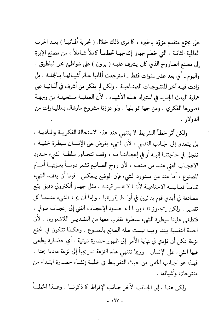 واليوم- أي بعد عشر سنوات فقط- استرجعت ألمانيا عالم أشيائها بالجملة، بل زادت فيه آخر المنتوجات الصناعية، ولكن لم يفكر من أشرف في ألمانيا على عملية البعث الجديد في استيراد هذه الأشياء، لأن العملية مستحيلة من وجهة تصورها الفكري، ومن جهة تمويلها، ولو عززنا مشروع مارشال بالمليارات من الدولار.