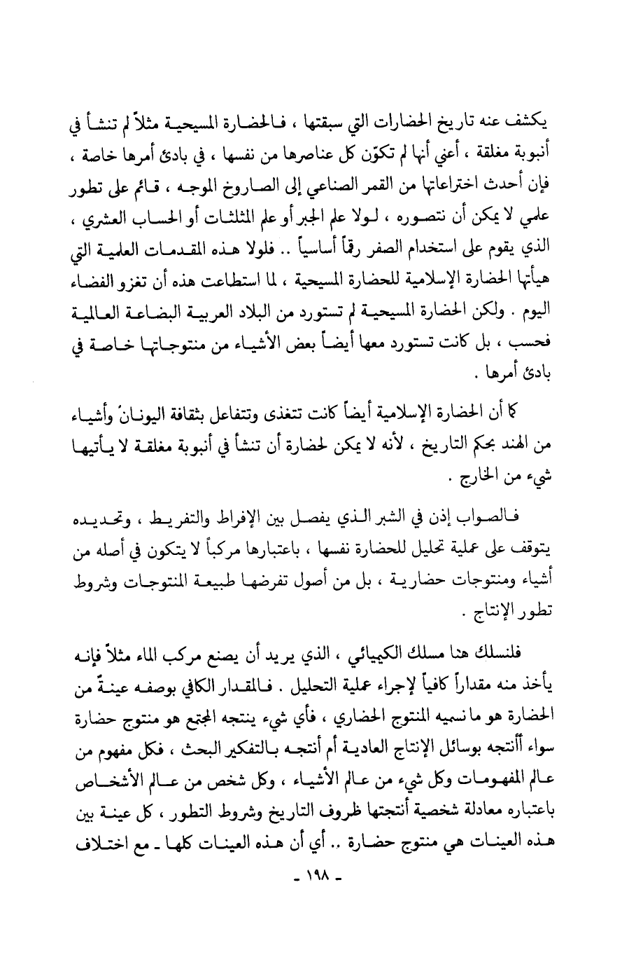 فالصواب إذن في الشبر الذي يفصل بين الإفراط والتفريط، وتحديده يتوقف على عملية تحليل للحضارة نفسها، باعتبارها مركباً لا يتكون في أصله من أشياء ومنتوجات حضارية، بل من أصول تفرضها طبيعة المنتوجات وشروط تطور الإنتاج.