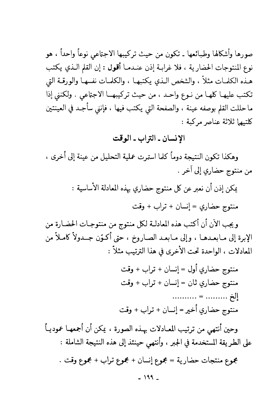 على الطريقة المستخدمة في الجبر، وأنتهي حينئذ إلى هذه النتيجة الشاملة: جموع منتجات حضارية = جموع إنسان + جموع تراب + جموع وقت.