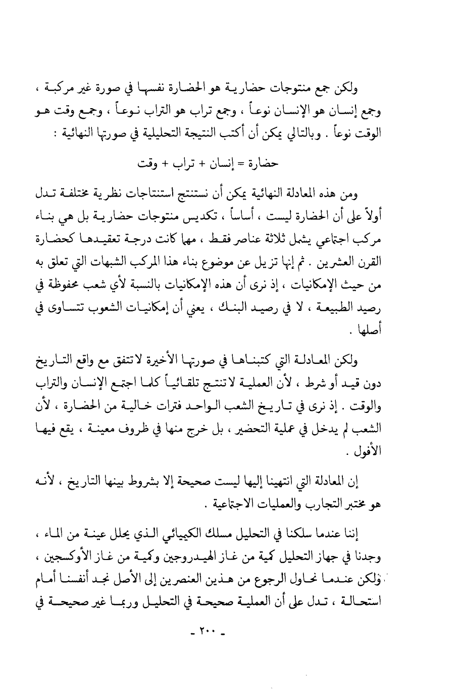 ولكن المعادلة التي كتبناها في صورتها الأخيرة لا تتفق مع واقع التاريخ دون قيد أو شرط، لأن العملية لا تنتج تلقائياً كلما اجتمع الإنسان والتراب والوقت. إذ نرى في تاريخ الشعب الواحد فترات خالية من الحضارة، لأن الشعب لم يدخل في عملية التحضير، بل خرج منها في ظروف معينة، يقع فيها الأفول.