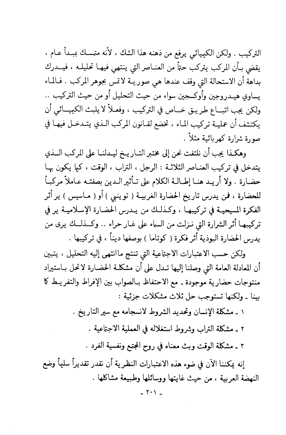 وهكذا يجب أن نلتفت نحن إلى مختبر التاريخ ليدلنا على المركب الذي يتدخل في تركيب العناصر الثلاثة: الرجل، التراب، الوقت، كيما يكون بها حضارة. ولا أريد هنا إطالة الكلام على تأثير الدين بصفته عاملاً مركباً للحضارة، فمن يدرس تاريخ الحضارة الغربية (تويني) أو (ماسيس) يرى أثر الفكرة المسيحية في تركيبها، وكذلك من يدرس الحضارة الإسلامية يرى في تركيبها أثر الشرارة التي نزلت من السماء على غار حراء .. وكذلك يرى من يدرس الحضارة البوذية أثر فكرة (كوتاما) بوصفها ديناً، في تركيبها.