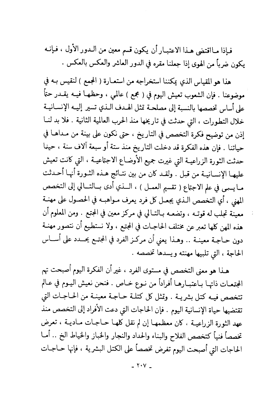 هذا هو المقياس الذي يمكننا استخراجه من استعارة (المجمع) لنقيس به في موضوعنا. فإن الشعوب تعيش اليوم في (مجمع) عالمي، وحظها فيه يقدر حتما على أساس تخصصها بالنسبة إلى مصلحة تمثل الهدف الذي تسير إليه الإنسانية خلال التطورات، التي حدثت في تاريخها منذ الحرب العالمية الثانية. فلا بد لنا إذن من توضيح فكرة التخصص في التاريخ، حتى نكون على بينة من مداها في حياتنا. فإن هذه الفكرة قد دخلت التاريخ منذ ستة أو سبعة آلاف سنة، حينما حدثت الثورة الزراعية التي غيرت جميع الأوضاع الاجتماعية، التي كانت تعيش عليها الإنسانية من قبل. ولقد كان من بين نتائج هذه الثورة أنها أحدثت ما يسمى في علم الاجتماع (تقسيم العمل)، الذي أدى بالتالي إلى التخصص المهني، أي التخصص الذي يجعل كل فرد يعرف مواهبه في الحصول على مهنة معينة تجلب له قوته، وتضعه بالتالي في مركز معين في المجتمع. ومن المعلوم أن هذه المهن كلها تعبر عن مختلف الحاجات في المجتمع، ولا نستطيع أن نتصور مهنة دون حاجة معينة .. وهذا يعني أن مركز الفرد في المجتمع يحدد على أساس الحاجة، التي تلبيها مهنته ويسدها تخصصه.