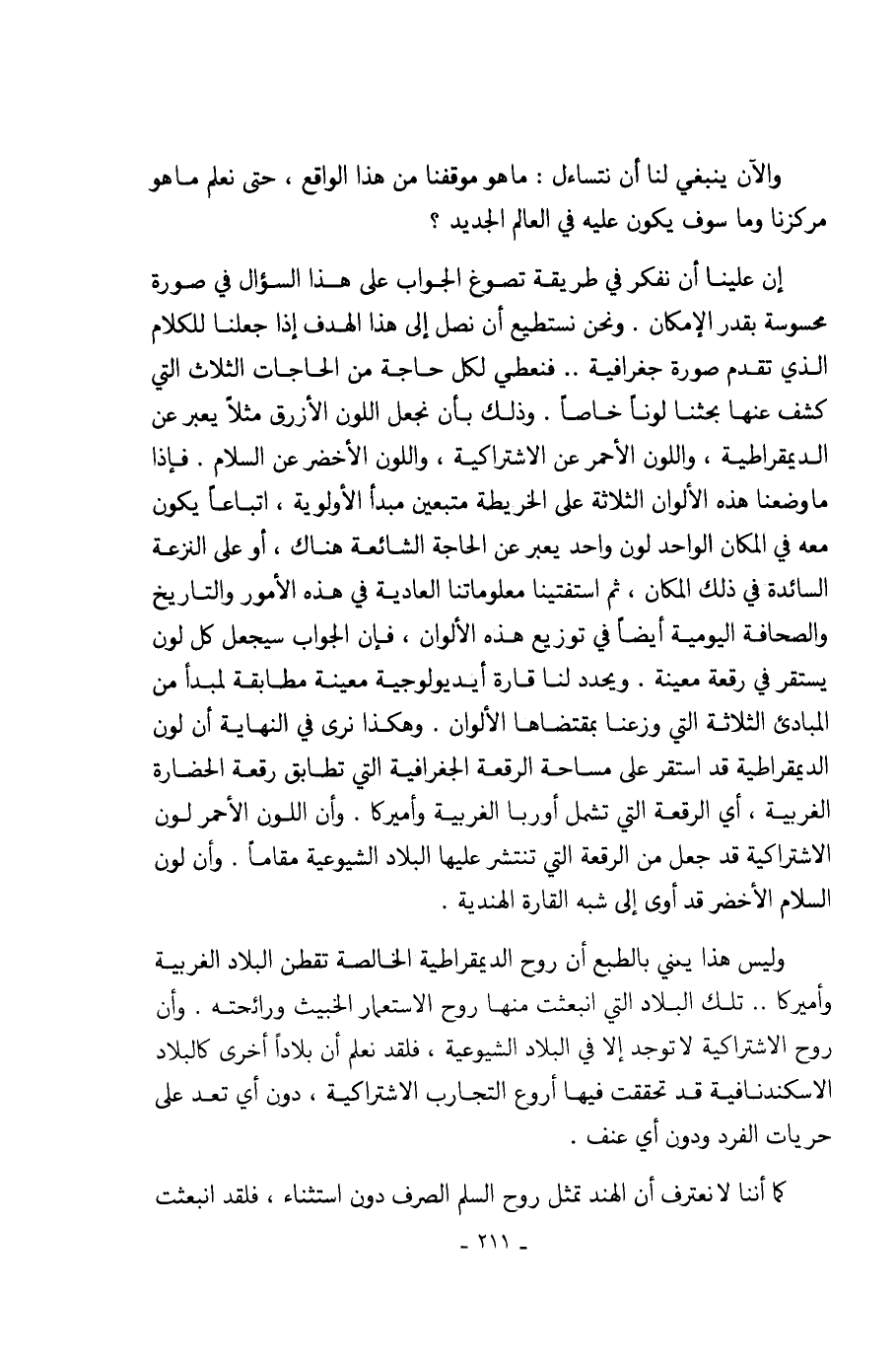 إن علينا أن نفكر في طريقة تصوغ الجواب على هذا السؤال في صورة محسوسة بقدر الإمكان. ونحن نستطيع أن نصل إلى هذا الهدف إذا جعلنا للكلام الذي تقدم صورة جغرافية .. فنعطي لكل حاجة من الحاجات الثلاث التي كشف عنها بحثنا لونا خاصاً. وذلك بأن نجعل اللون الازرق مثلاً يعبر عن الديمقراطية، واللون الأحمر عن الاشتراكية، واللون الاخضر عن السلام. فإذا ما وضعنا هذه الالوان الثلاثة على الخريطة متبعين مبدأ الأولوية، اتباعا يكون معه في المكان الواحد لون واحد يعبر عن الحاجة الشائعة هناك، أو على النزعة السائدة في ذلك المكان، ثم استفتينا معلوماتنا العادية في هذه الامور والتاريخ والصحافة اليومية أيضا في توزيع هذه الالوان، فإن الجواب سيجعل كل لون يستقر في رقعة معينة. ويحدد لنا قارة أيديولوجية معينة مطابقة لمبدأ من المبادئ الثلاثة التي وزعنا بمقتضاها الالوان. وهكذا نرى في النهاية أن لون الديمقراطية قد استقر على مساحة الرقعة الجغرافية التي تطابق رقعة الحضارة الغربية، أي الرقعة التي تشمل أوربا الغربية وأميركا. وأن اللون الاحمر لون الاشتراكية قد جعل من الرقعة التي تنتشر عليها البلاد الشيوعية مقاماً. وأن لون السلام الاخضر قد أوى إلى شبه القارة الهندية.