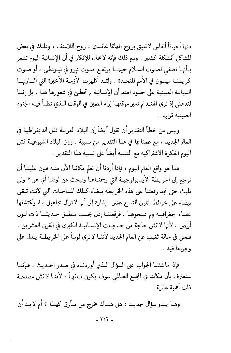 هذا هو واقع العالم اليوم، فإذا أردنا أن نعلم مكاننا الآن منه فإن علينا أن نرجع إلى الخريطة الايديولوجية التي رسمناها ونبحث عن لوننا أي هو؟ ولن نلبث حتى نجد رقعتنا على هذه الخريطة بيضاء كتلك الساحات التي كانت تبقى بيضاء على خرائط القرن التاسع عشر. إشارة إلى أنها لا تزال مجاهيل، لم يكتشفها علماء الجغرافية ولم يمسحوها. فرقعتنا إذن بحسب منطق حديثنا ذات لون أبيض، لأنها لا تمثل حاجة من حاجات الإنسانية الكبرى في القرن العشرين. فنحن في حالة تغيب عن العالم الجديد لأننا لا نرى لوناً على الخريطة يدل على وجودنا فيه.