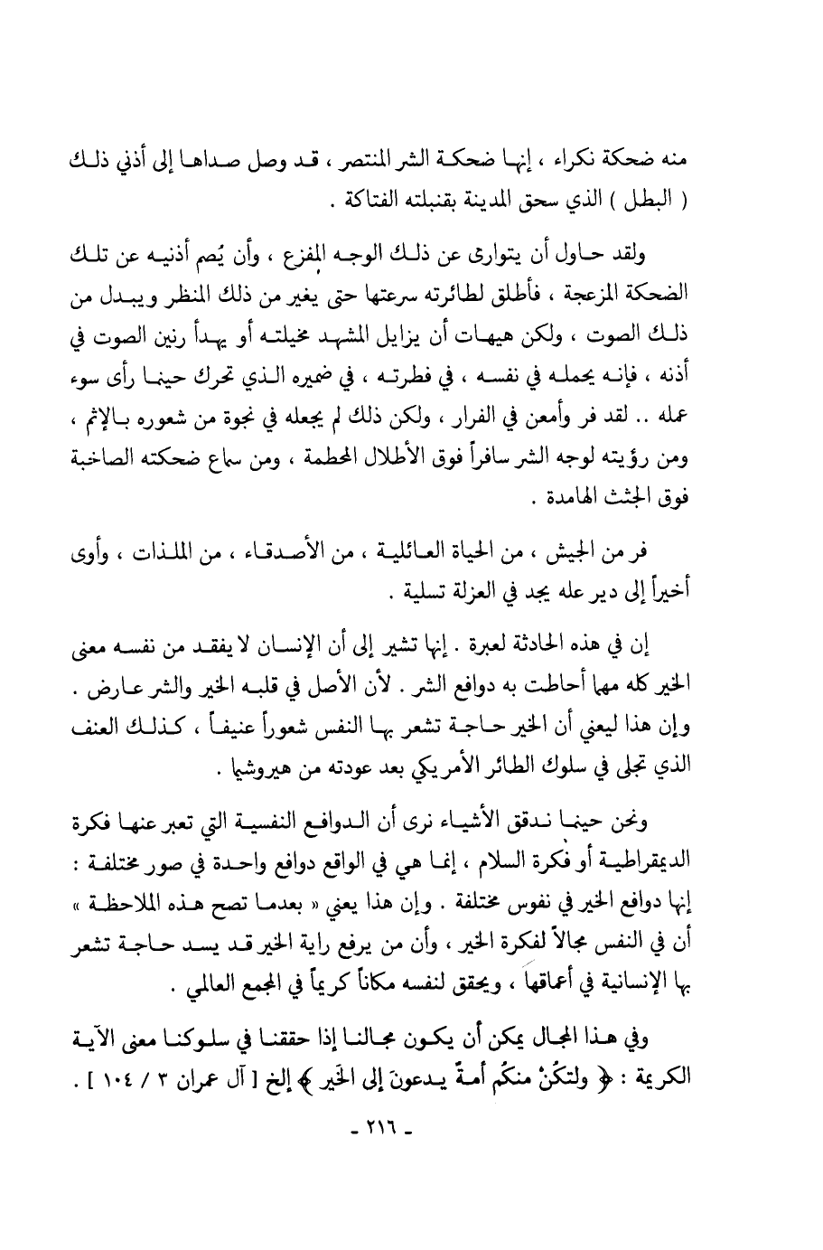 إن في هذه الحادثة لعبرة. إنها تشير إلى أن الإنسان لا يفقد من نفسه معنى الخير كله مهما أحاطت به دوافع الشر. لأن الأصل في قلبه الخير والشر عارض. وإن هذا ليعني أن الخير حاجة تشعر بها النفس شعوراً عنيفا، كذلك العنف الذي تجلى في سلوك الطائر الأمريكي بعد عودته من هيروشما.
