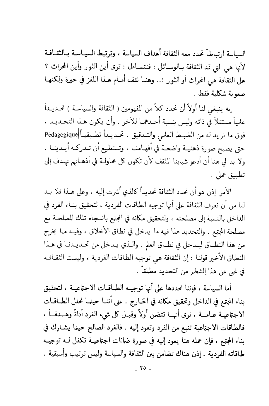 بناء المجتمع في الداخل وتحقيق مكانه في الخارج. على أننا حينما نحلل الطاقات الاجتماعية عأمة، نرى أنها تتضمن أولاً وقبل كل شيء الفرد أداةً وهدفاً، فالطاقات الاجتماعية تنبع من الفرد وتعود إليه. فالفرد الصالح حينما يشارك في بناء المجتمع، فإن عمله هنا يعود إليه في صورة ضمانات اجتماعية تكفل له توجيه طاقاته الفردية. إذن هناك تضامن بين الثقافة والسياسة وليس ترتيب وأسبقية.
