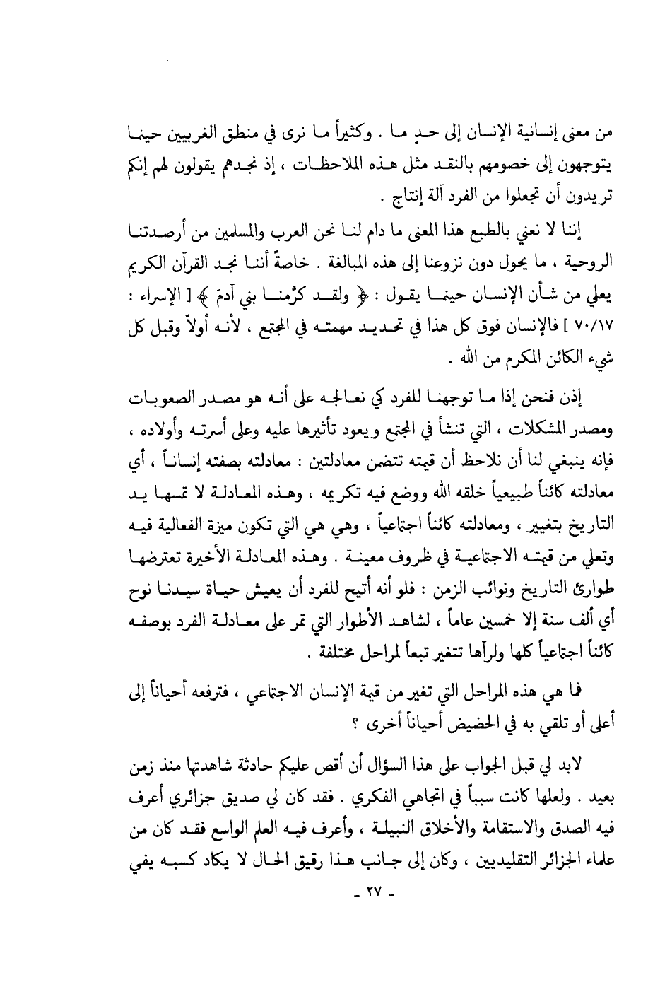 إذن فنحن إذا ما توجهنا للفرد كي نعالجه على أنه هو مصدر الصعوبات ومصدر المشكلات، التي تنشأ في المجتمع ويعود تأثيرها عليه وعلى أسرته وأولاده، فإنه ينبغي لنا أن نلاحظ أن قيمته تتضمن معادلتين: معادلته بصفته إنساناً، أي معادلته كائناً طبيعياً خلقه الله ووضع فيه تكريمه، وهذه المعادلة لا تمسها يد التاريخ بتغيير، ومعادلته كائناً اجتماعياً، وهي هي التي تكون ميزة الفعالية فيه وتعلي من قيمته الاجتماعية في ظروف معينة. وهذه المعادلة الاخيرة تعترضها طوارئ التاريخ ونوائب الزمن: فلو أنه أتيح للفرد أن يعيش حياة سيدنا نوح أي ألف سنة إلا خمسين عاماً، لشاهد الاطوار التي تمر على معادلة الفرد بوصفه كائناً اجتماعياً كلها ولرآها تتغير تبعاً لمراحل مختلفة.