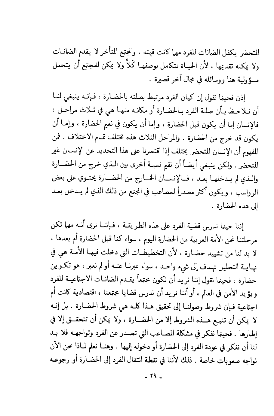إننا حينما ندرس قضية الفرد على هذه الطريقة، فإننا نرى أنه مهما تكن مرحلتنا نحن الأمة العربية من الحضارة اليوم، سواء كنا قبل الحضارة أم بعدها، لا بد لنا من تشييد حضارة، لأن التخطيطات التي دخلت فيها الأمة هي في نهاية التحليل تهدف إلى شيء واحد، سواء عبرنا عنه أو لم نعبر، هو تكوين حضارة، فحينما نقول إننا نريد أن نكون مجتمعاً يقدم الضمانات الاجتماعية للفرد ويؤيد الامن في العالم، أو أننا نريد أن ندرس قضايا مجتمعنا، إقتصادية كانت أم اجتماعية فإن شروط وصولنا إلى تحقيق هذا كله هي شروط الحضارة. بل إنه لا يمكن أن تنبع هذه الشروط إلا من الحضارة، ولا يمكن أن تتحقق إلا في إطارها. فحينما نفكر في مشكلة المصاعب التي تصدر عن الفرد وتواجهه فلا بد لنا أن نفكر في عودة الفرد إلى الحضارة أو دخوله إليها. وهنا نعلم لماذا نحن الآن نواجه صعوبات خاصة. ذلك لأننا في نقطة انتقال الفرد إلى الحضارة أو رجوعه