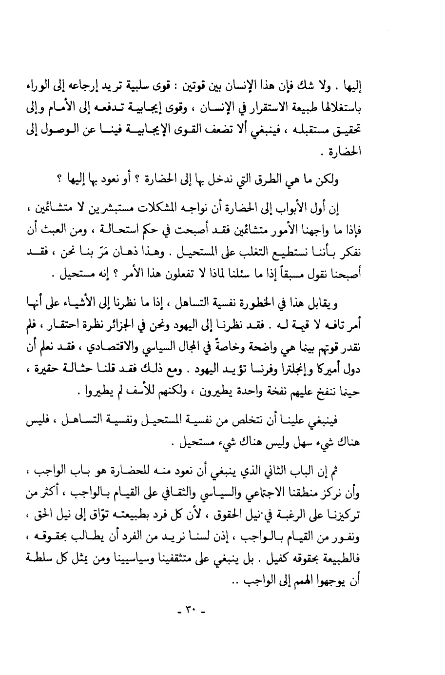 إليها. ولا شك فإن هذا الإنسان بين قوتين: قوى سلبية تريد إرجاعه إلى الوراء باستغلالها طبيعة الاستقرار في الإنسان، وقوى إيجابية تدفعه إلى الامام وإلى تحقيق مستقبله، فينبغي ألا تضعف القوى الإيجابية فينا عن الوصول إلى الحضارة.
