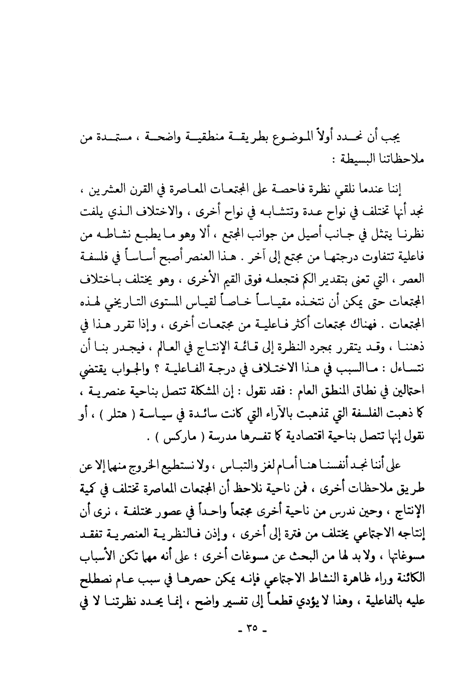 نجد أنها تختلف في نواح عدة وتتشابه في نواح أخرى، والإختلاف الذي يلفت نظرنا يتمثل في جانب أصيل من جوانبا المجتمع، ألا وهو ما يطبع نشاطه من فاعلية تتفاوت درجتها من مجتمع إلى آخر. هذا العنصر أصبح أساساً في فلسفة العصر، التي تعنى بتقدير الكم فتجعله فوق القيم الأخرى، وهو يختلف باختلاف المجتمعات حتى يمكن أن نتخذه مقياساً خاصاً لقياس المستوى التاريخي لهذه المجتمعات. فهناك مجتمعات أكثر فاعلية من مجتمعات أخرى، وإذا تقرر هذا في ذهننا، وقد يتقرر بمجرد النظرة إلى قائمة الإنتاج في العالم، فيجدر بنا أن نتساءل: ما السبب في هذا الاختلاف في درجة الفاعلية؟ والجواب يقتضي احتمالين في نطاق المنطق العام: فقد نقول: إن المشكلة تتصل بناحية عنصرية، كما ذهبت الفلسفة التي تمذهبت بالآراء التي كانت سائدة في سياسة (هتلر)، أو نقول إنها تتصل بناحية إقتصادية كما تفسرها مدرسة (ماركس).
