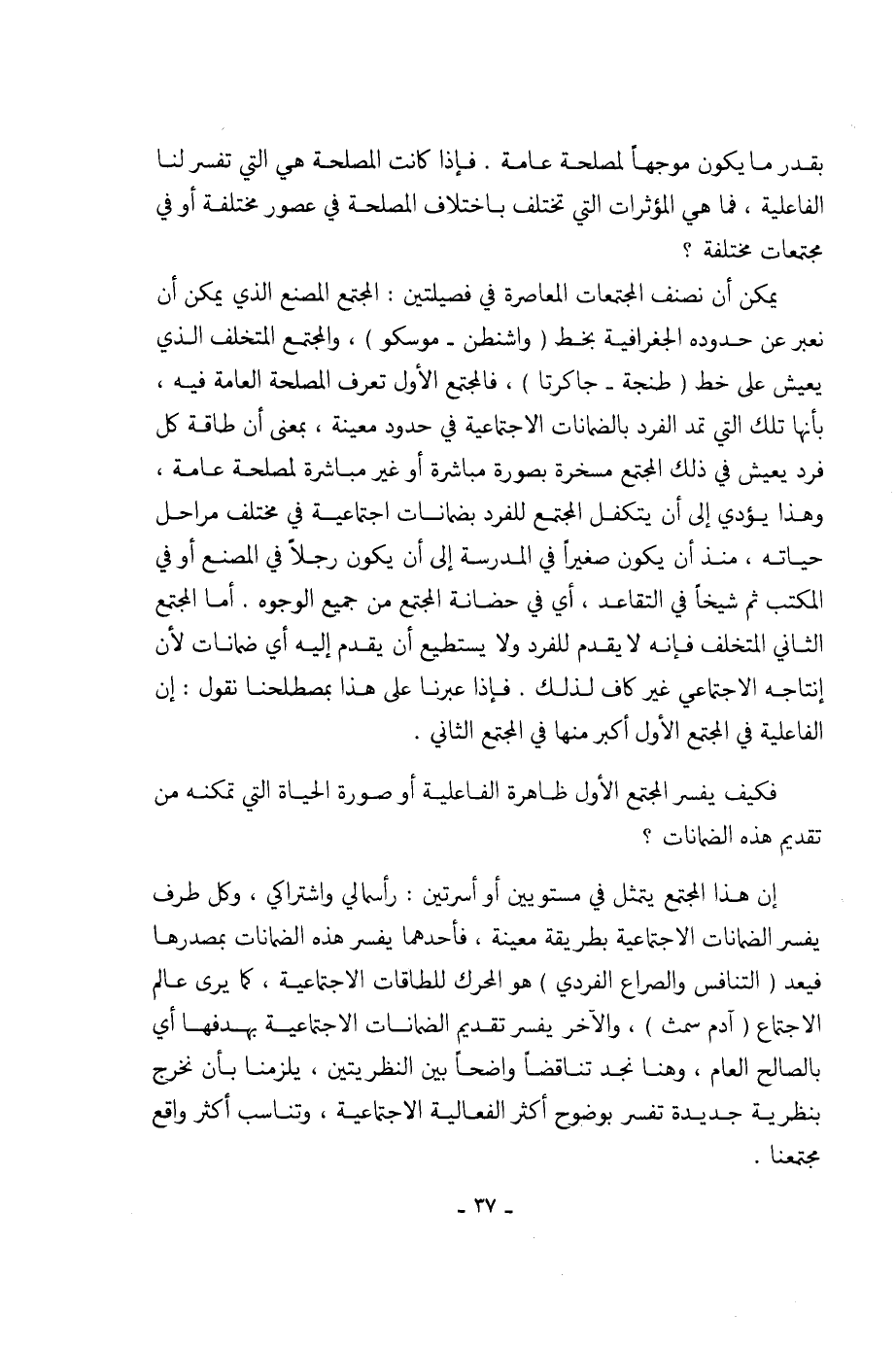 نعبر عن حدوده الجغرافية بخط (واشنطن- موسكو)، والمجتمع المتخلف الذي يعيش على خط (طنجة- جاكرتا)، فالمجتمع الأول تعرف المصلحة العأمة فيه، بأنها تلك التي تمد الفرد بالضمانات الاجتماعية في حدود معينة، بمعنى أن طاقة كل فرد يعيش في ذلك المجتمع مسخرة بصورة مباشرة أو غير مباشرة لمصلحة عأمة، وهذا يؤدي إلى أن يتكفل المجتمع للفرد بضمانات اجتماعية في مختلف مراحل حياته، منذ أن يكون صغيراً في المدرسة إلى أن يكون رجلاً في المصنع أو في المكتب ثم شيخاً في التقاعد، أي في حضانة المجتمع من جميع الوجوه. أما المجتمع الثاني المتخلف فإنه لا يقدم للفرد ولا يستطيع أن يقدم إليه أي ضمانات لأن إنتاجه الاجتماعي غير كاف لذلك. فإذا عبرنا على هذا بمصطلحنا نقول: إن الفاعلية في المجتمع الأول أكبر منها في المجتمع الثاني.