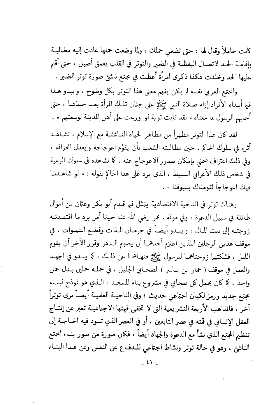 وهناك توتر في الناحية الإقتصادية يتمثل فيما قدم أبو بكر وعثمان من أموال طائلة في سبيل الدعوة، وفي موقف عمر رضي الله عنه حينما أمر برد ما اقتصدته زوجته إلى بيت المال، ويبدو أيضاً في حرمان الذات وقطع الشهوات، في موقف هذين الرجلين اللذين اعتزم أحدهما أن يصوم الدهر وقرر الآخر أن يقوم الليل، فشكتهما زوجتاهما للرسول - صلى الله عليه وسلم - فنهاهما عن ذلك. كما يبدو في الجهد والعمل في موقف (عمار بن ياسر) الصحابي الجليل، في حمله حملين بدل حمل واحد، كما كان يحمل كل صحابي في مشروع بناء المسجد، الذي هو نموذج لبناء مجتمع جديد ورمز لكيان اجتماعي حديث؛ وفي الناحية العلمية أيضاً نرى توتراً آخر، فالمذاهب الاربعة التشريعية التي لا تخفى قيمتها الاجتماعية تعبر عن إنتاج العقل الإنساني في قمته في عصر التابعين، أو في العصر الذي تسود فيه الحاجة إلى تنظيم المجتمع الذي نشأ مع الدعوة والجهاد أيضاً، فكان صورة من صور بناء المجتمع الناشئ، وهو في حالة توتر ونشاط اجتماعي للدفاع عن النفس وعن هذا البناء