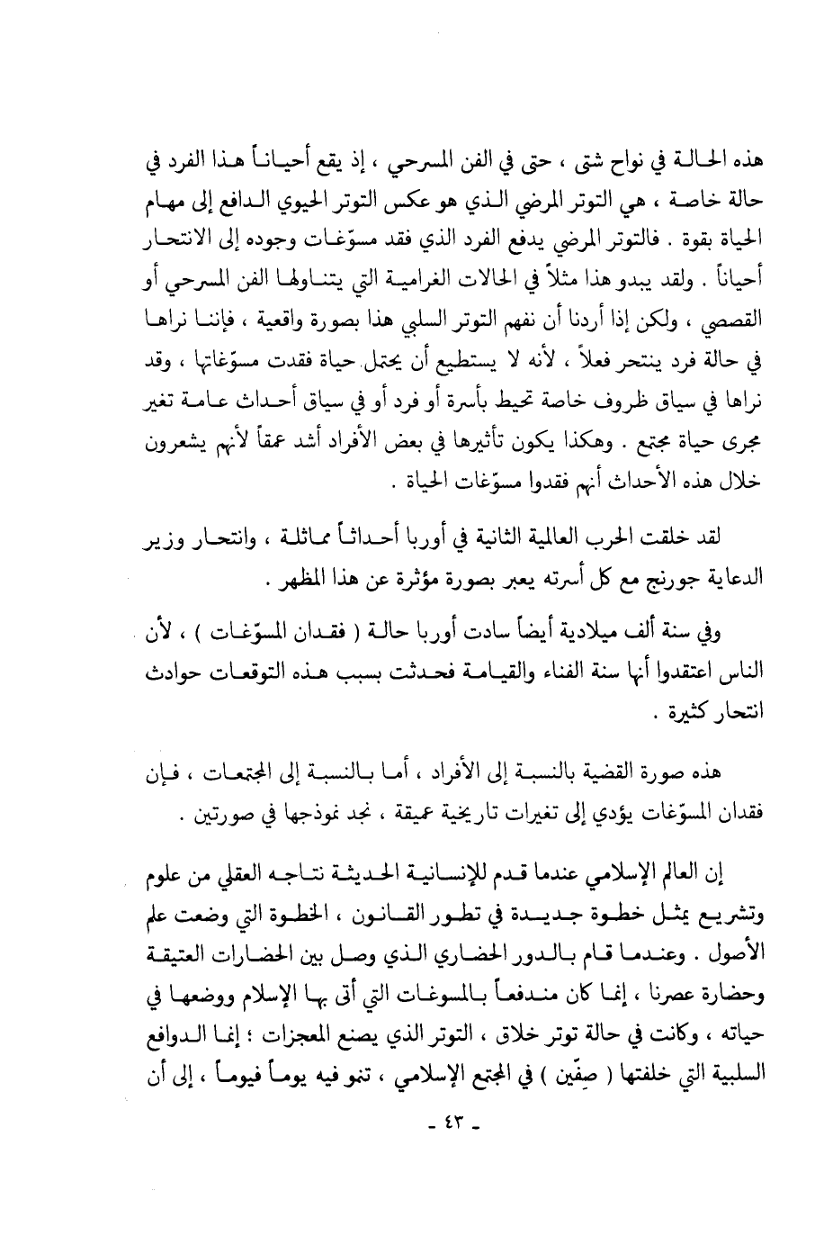 هذه الحالة في نواح شتى، حتى في الفن المسرحي، إذ يقع أحياناً هذا الفرد في حالة خاصة، هي التوتر المرضي الذي هو عكس التوتر الحيوي الدافع إلى مهام الحياة بقوة. فالتوتر المرضي يدفع الفرد الذي فقد مسوّغات وجوده إلى الأنتحار أحياناً. ولقد يبدو هذا مثلاً في الحالات الغرامية التي يتناولها الفن المسرحي أو القصصي، ولكن إذا أردنا أن نفهم التوتر السلبي هذا بصورة واقعية، فإننا نراها في حالة فرد ينتحر فعلاً، لأنه لا يستطيع أن يحتمل حياة فقدت مسوّغاتها، وقد نراها في سياق ظروف خاصة تحيط بأسرة أو فرد أو في سياق أحداث عأمة تغير مجرى حياة مجتمع. وهكذا يكون تأثيرها في بعض الأفراد أشد عمقاً لأنهم يشعرون خلال هذه الأحداث أنهم فقدوا مسوّغات الحياة.