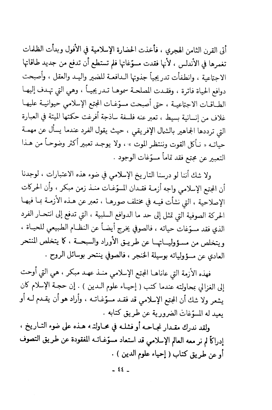 إلى الغزالي بمحاولته عندما كتب (إحياء علوم الدين). إن حجة الإسلام كان يشعر ولا شك أن المجتمع الإسلامي قد فقد مسوّغاته، وأراد هو أن يقدم له أو يعيد له المسوّغات الضرورية عن طريق كتابه.
