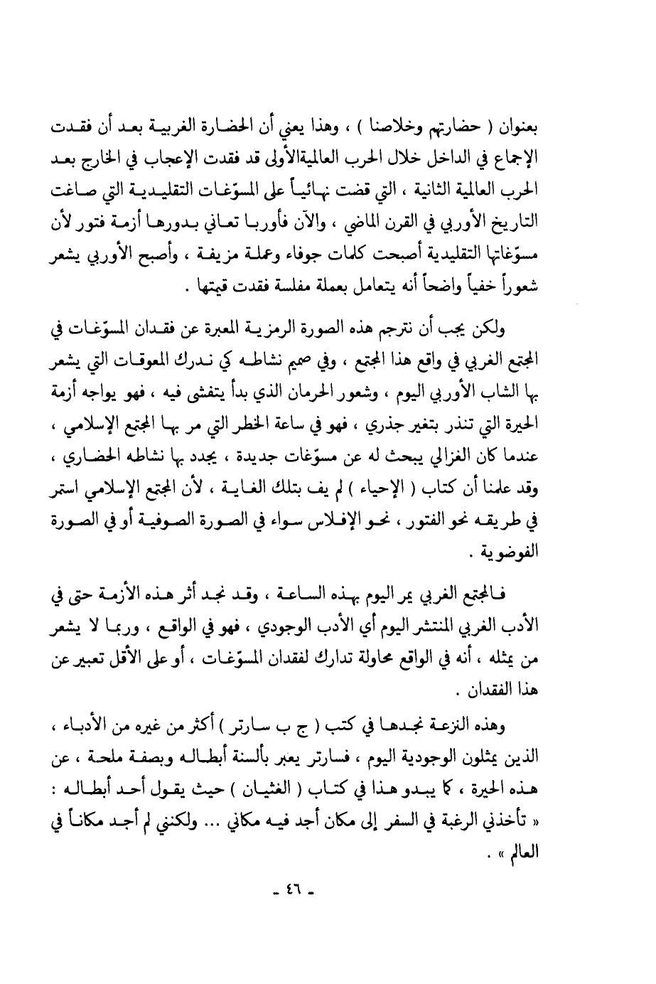 فالمجتمع الغربي يمر اليوم بهذه الساعة، وقد نجد أثر هذه الازمة حتى في الادب الغربي المنتشر اليوم أي الادب الوجودي، فهو في الواقع، وربما لا يشعر من يمثله، أنه في الواقع محاولة تدارك لفقدان المسوّغات، أو على الاقل تعبير عن هذا الفقدان.
