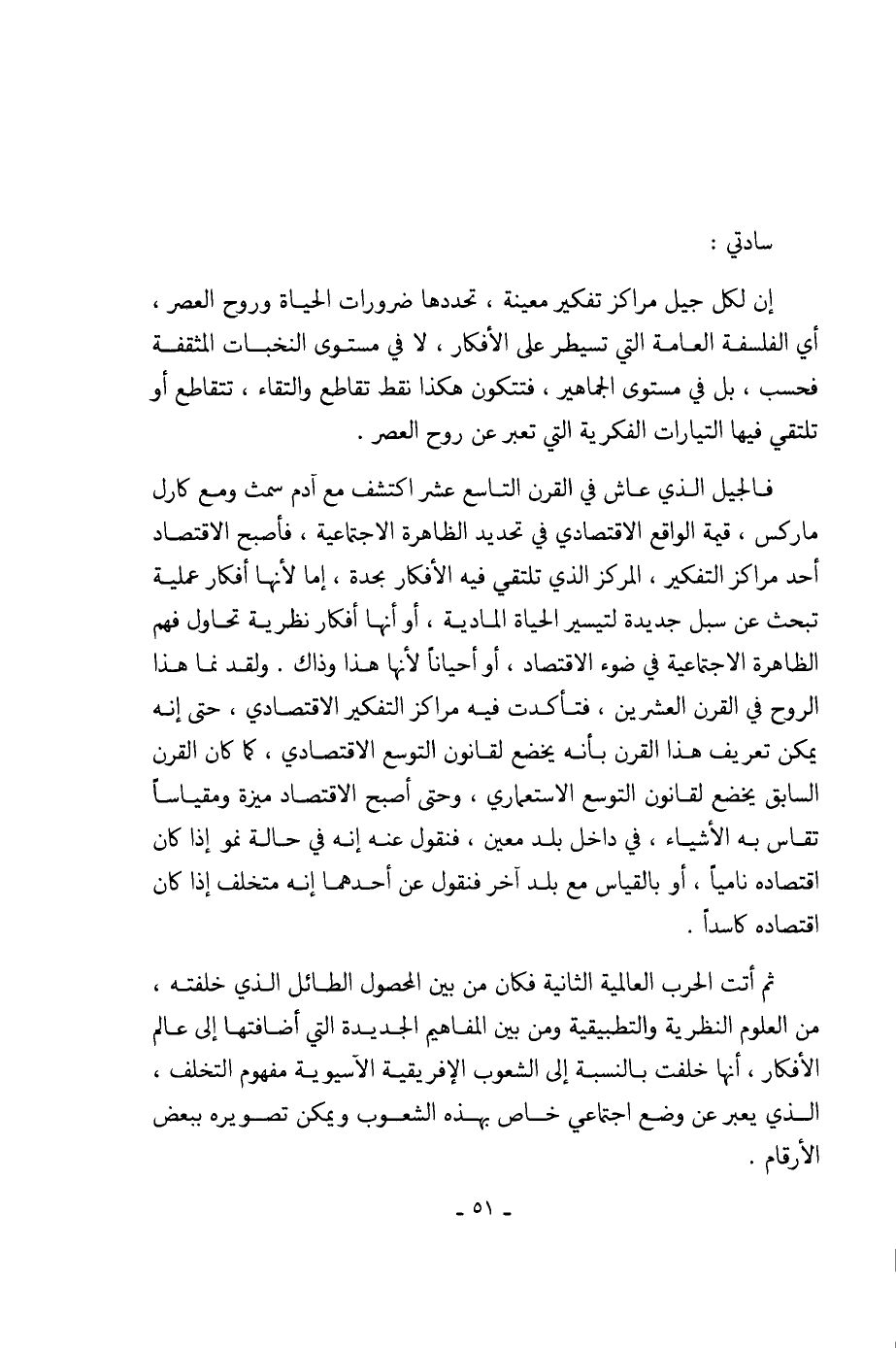 فالجيل الذي عاش في القرن التاسع عشر اكتشف مع آدم سمث ومع كارل ماركس، قيمة الواقع الإقتصادي في تحديد الظاهرة الاجتماعية، فأصبح الإقتصاد أحد مراكز التفكير، المركز الذي تلتقي فيه الأفكار بحدة، إما لأنها أفكار عملية تبحث عن سبل جديدة لتيسير الحياة المادية، أو أنها أفكار نظرية تحاول فهم الظاهرة الاجتماعية في ضوء الإقتصاد، أو أحياناً لأنها هذا وذاك. ولقد نما هذا الروح في القرن العشرين، فتأكدت فيه مراكز التفكير الإقتصادي، حتى إنه يمكن تعريف هذا القرن بأنه يخضع لقانون التوسع الإقتصادي، كما كان القرن السابق يخضع لقانون التوسع الإستعماري، وحتى أصبح الإقتصاد ميزة ومقياساً تقاس به الأشياء، في داخل بلد معين، فنقول عنه إنه في حالة نمو إذا كان إقتصاده نامياً، أو بالقياس مع بلد آخر فنقول عن أحدهما إنه متخلف إذا كان إقتصاده كاسداً.