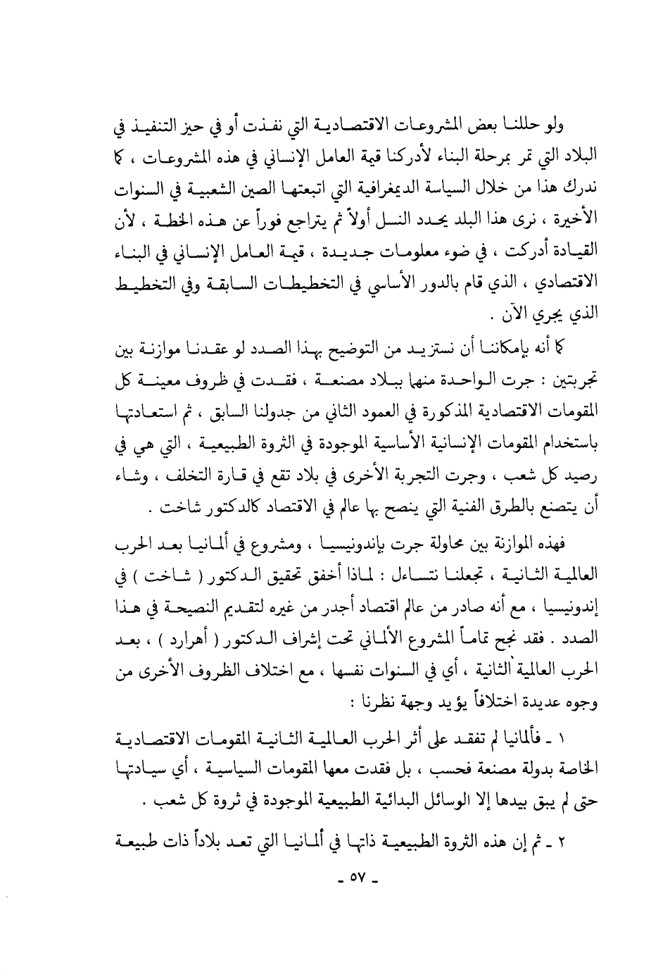 كما أنه بإمكاننا أن نستزيد من التوضيح بهذا الصدد لو عقدنا موازنة بين تجربتين: جرت الواحدة منهما ببلاد مصنعة، فقدت في ظروف معينة كل المقومات الإقتصادية المذكورة في العمود الثاني من جدولنا السابق، ثم استعادتها باستخدام المقومات الإنسانية الأساسية الموجودة في الثروة الطبيعية، التي هي في رصيد كل شعب، وجرت التجربة الأخرى في بلاد تقع في قارة التخلف، وشاء أن يتصنع بالطرق الفنية التي ينصح بها عالم في الإقتصاد كالدكتور شاخت.