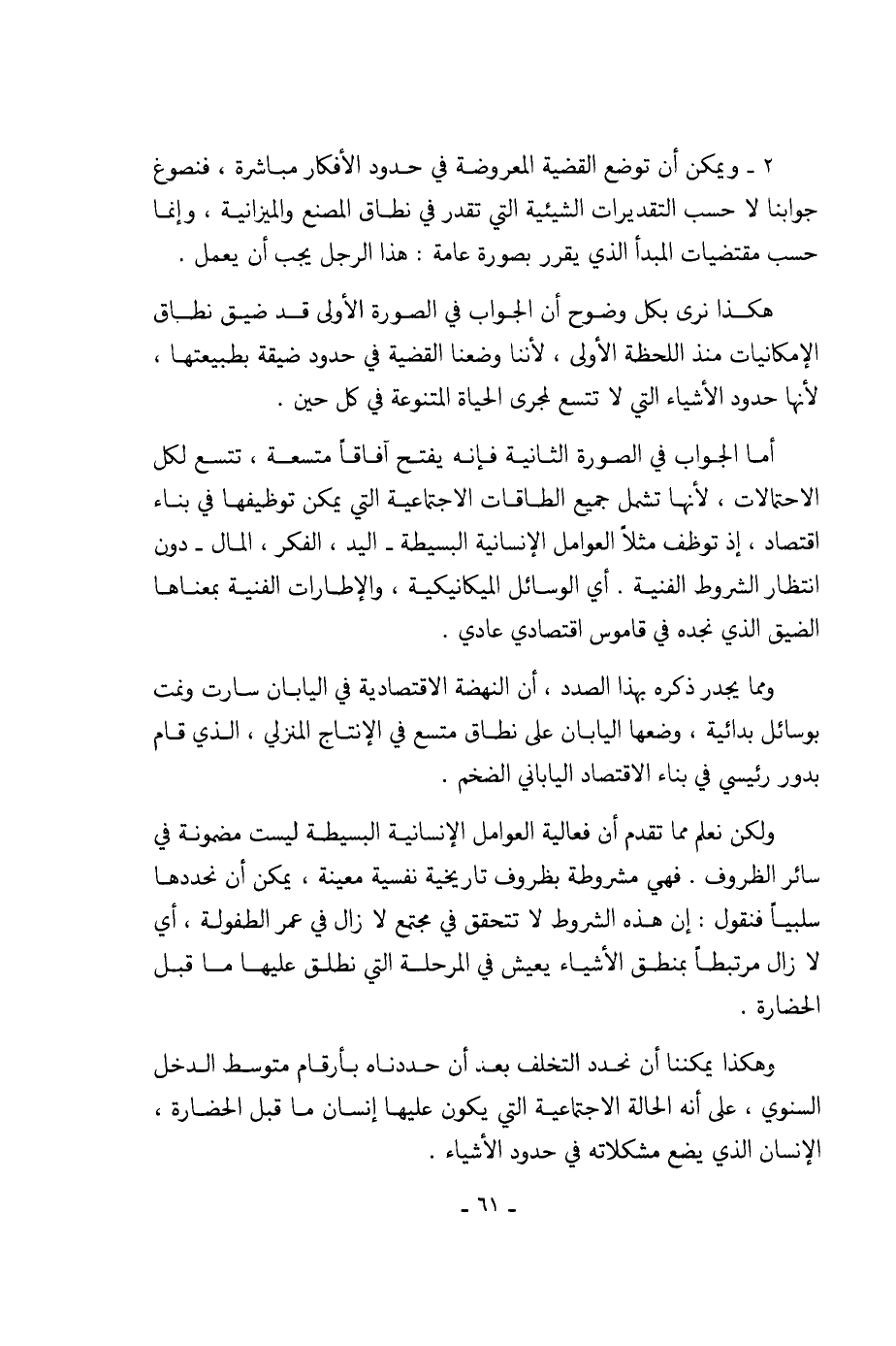 أما الجواب في الصورة الثانية فإنه يفتح آفاقاً متسعة، تتسع لكل الاحتمالات، لأنها تشمل جميع الطاقات الاجتماعية التي يمكن توظيفها في بناء إقتصاد، إذ توظف مثلاً العوامل الإنسانية البسيطة- اليد، الفكر، المال- دون انتظار الشروط الفنية. أي الوسائل الميكانيكية، والإطارات الفنية بمعناها الضيق الذي نجده في قاموس إقتصادي عادي.