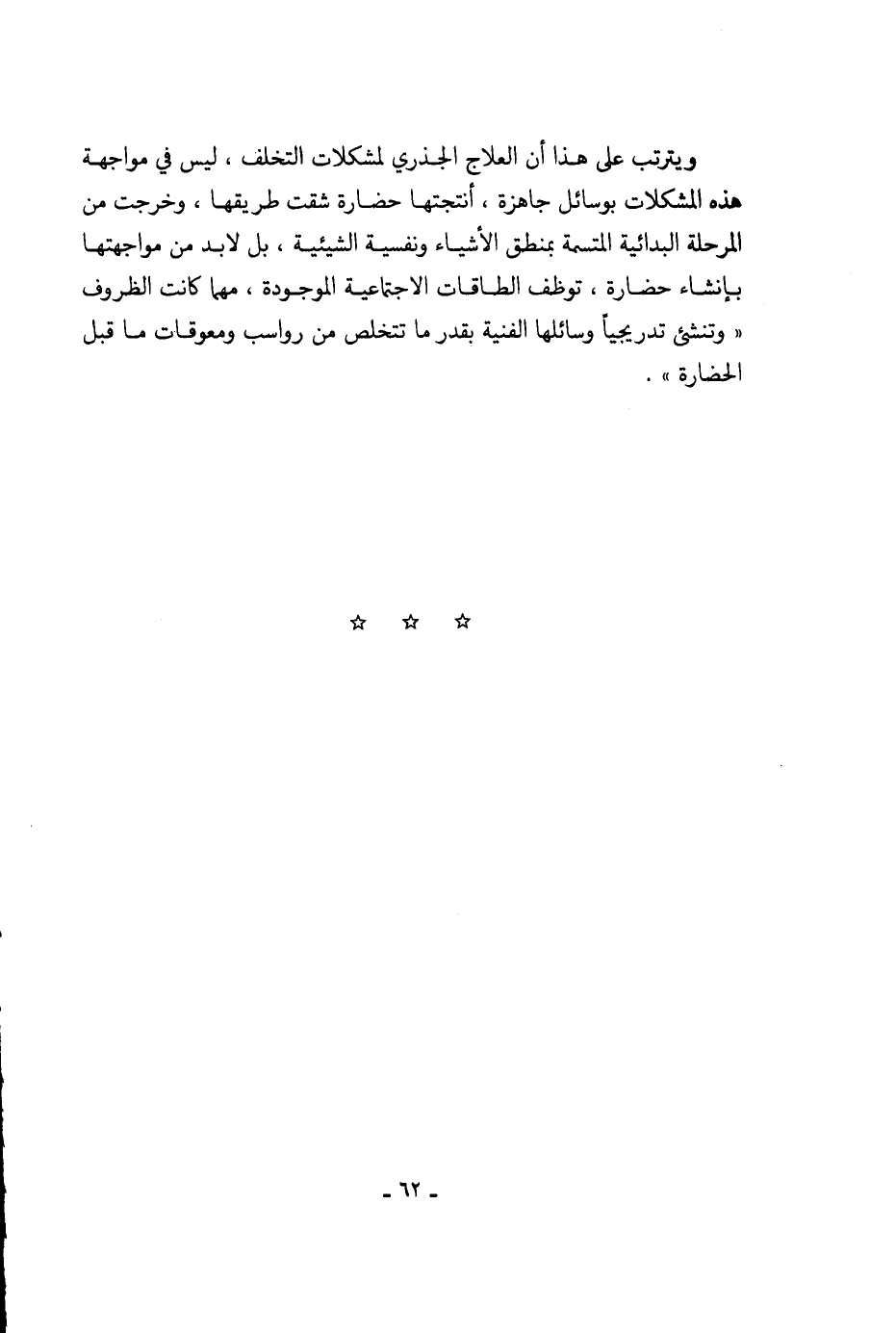 ويترتب على هذا أن العلاج الجذري لمشكلات التخلف، ليس في مواجهة هذه المشكلات بوسائل جاهزة، أنتجتها حضارة شقت طريقها، وخرجت من المرحلة البدائية المتسمة بمنطق الأشياء ونفسية الشيئية، بل لابد من مواجهتها بإنشاء حضارة، توظف الطاقات الاجتماعية الموجودة، مهما كانت الظروف ((وتنشئ تدريجياً وسائلها الفنية بقدر ما تتخلص من رواسب ومعوقات ما قبل الحضارة)).