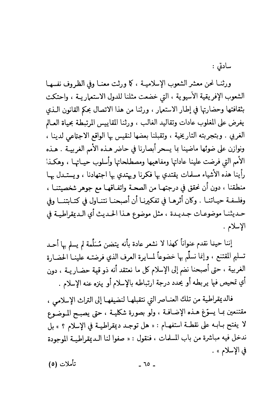 ورثنا نحن معشر الشعوب الإسلامية، كما ورثت معنا وفي الظروف نفسها الشعوب الإفريقية الآسيوية، التي خضعت مثلنا للدول الإستعمارية، واحتكت بثقافتها وحضارتها في إطار الإستعمار، ورثنا من هذا الاتصال بحم القانون الذي يفرض على المغلوب عادات وتقاليد الغالب، ورثنا المقاييس المرتبطة بحياة العالم الغربي. وبتجربته التاريخية، وتقبلنا بعضها لنقشى بها الواقع الاجتماعي لدينا، ونوازن على ضوئها ماضينا بما يسحر أبصارنا في حاضر هذه الامم الغربية. هذه الامم التي فرصا علينا عاداتها ومفاهيهها ومصطلحا! اوأسلوب حياتها، وهكذا رأينا هذه الأشياء مس! ات يقتدي بها فكرنا ويهتدي بها اجتهادنا، ويستدل بها منطقنا، دون أن نحقق في درجتها من الصحة واتفاقها مع جوهر شخصيتنا، وفلسفة حياتنا. وكان أثرها في تفكيرنا أن أصبحنا نتناول! ني كتابتنا وفي حديثنا موضوعات جديدة، مثل موضوع هذا الحديث أي الديمقراطية في ال! سلام.