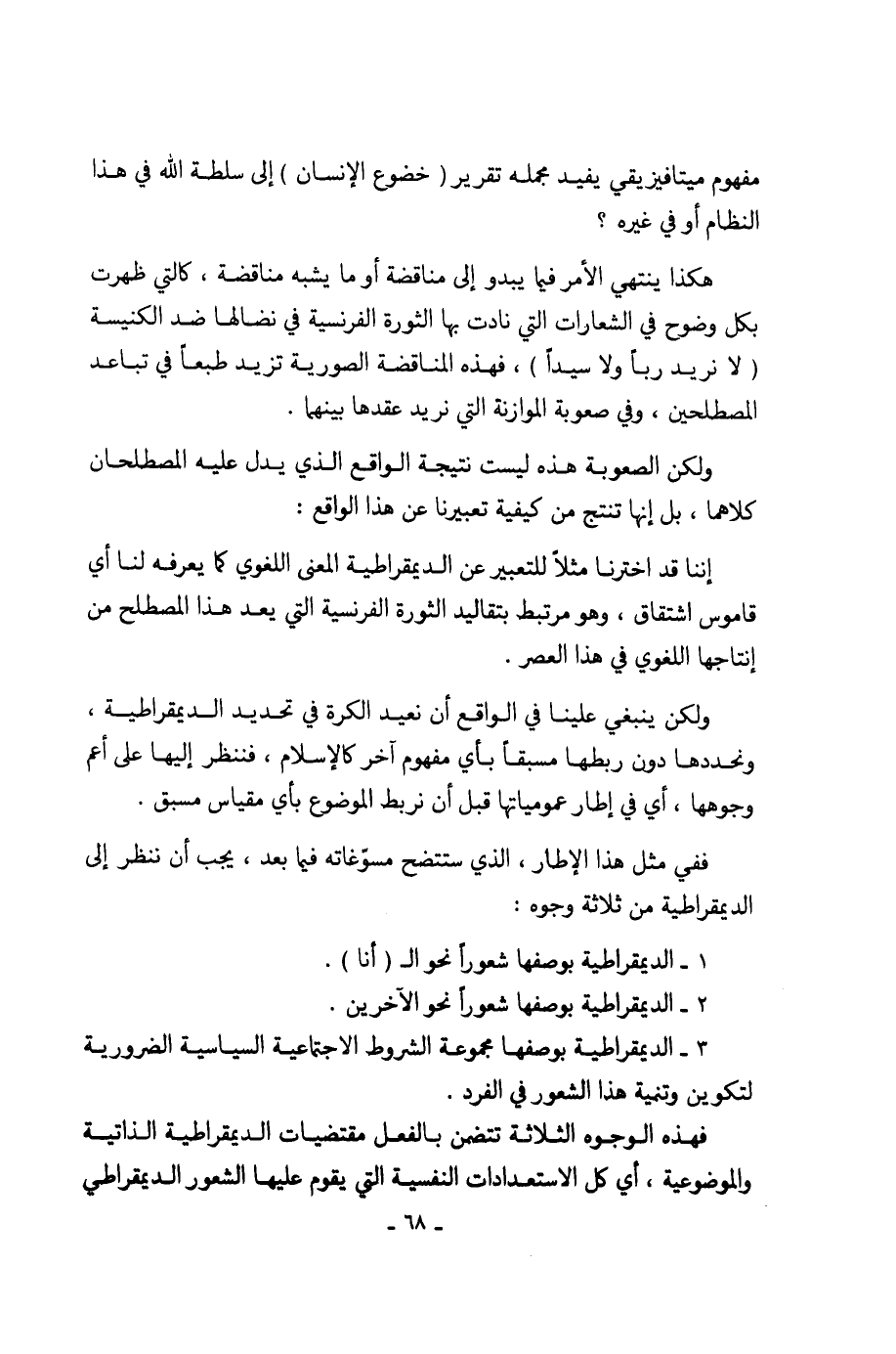 ولكن ينبغي علينا في الواقع أن نعيد الكرة في تحديد الديمقراطية، ونحددها دون ربطها مسبقاً باي مفهوم آخر؟ لإسلام، فننظر إليها على أم وجوهها، أي في إطارممومياتها قبل أن نربط الموضوع باي مقياس مسبق.