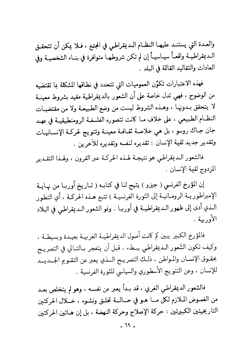 من الوضوح، فهي تدلط خاصة على أن الشعور بالديمقرا! ية مقيد بشروط معينة لا يتحقق بدونها، وهذه الشروط ليست من وضع الطبيعة ولا من مقتضيات النظام الطبيعي، على خلاف ما؟ فت تتصوره الفلسفة الرومنطيقية في عهد جان جاك روسو، بل هي خلاصة ثقافة معينة وتتويج لحركة الإنسانيات وتقدير جديد لقيمة الإنسان: تقديره لنفسه وتقديره للآخرين.