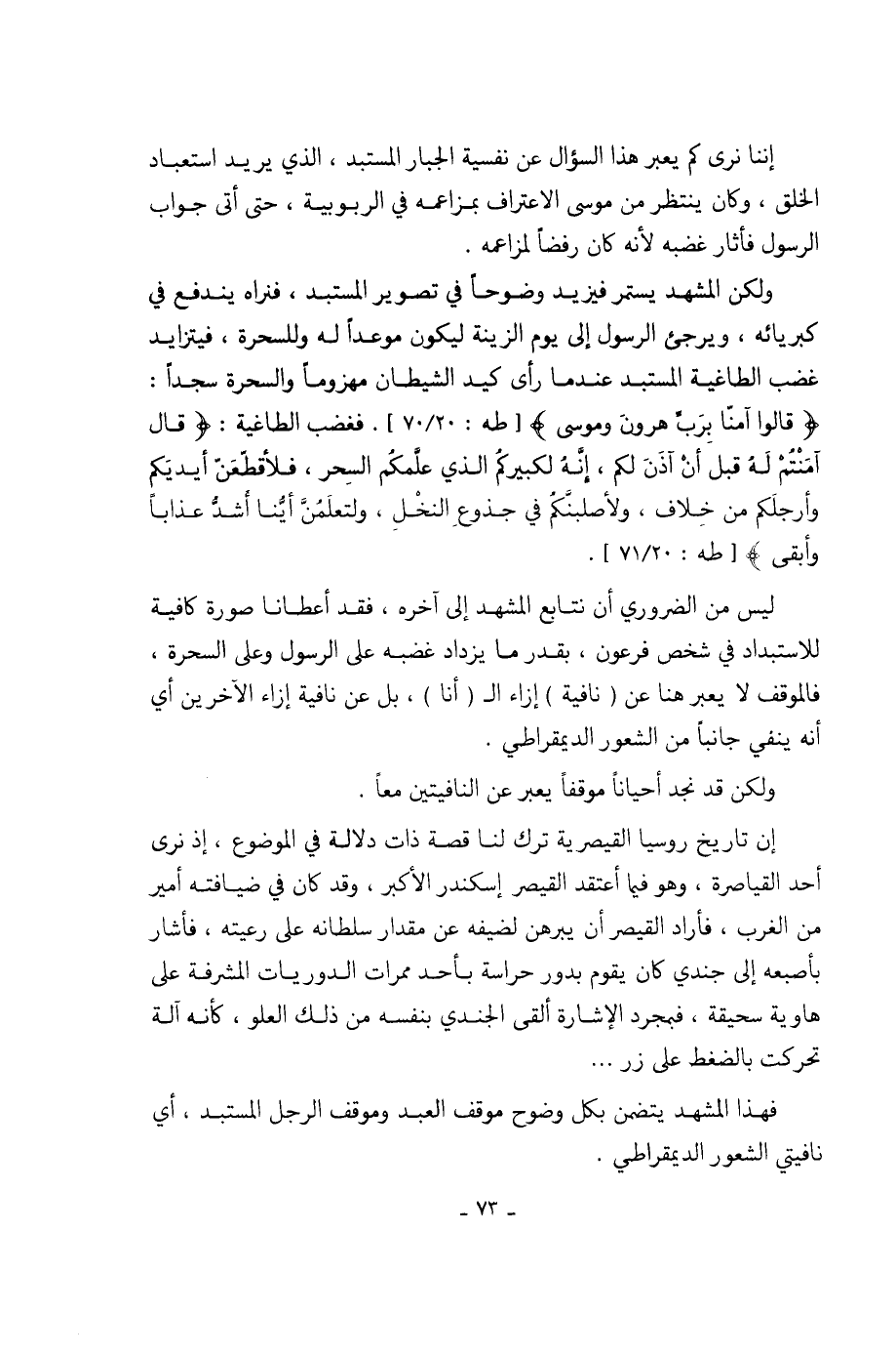 لشى من الضروري أن نتابع الشهد إلى آخره، فقد أعطانا صورة؟ فية للاستبداد في شخص فرعون، بقدرما يزداد غضبه على الرسول وعلى السحرة، فالوقف لا يعبر هنا عن (نافية) إزاء ال (أنا)، بل عن نافية إزاء الآخرين أي أنه ينفي جانباً من الشعور الديمقراطي.