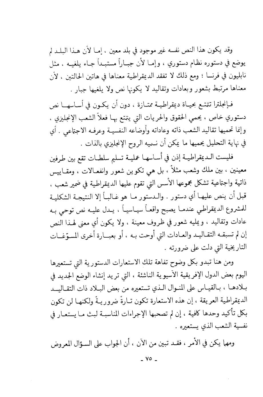 فليست الديمقراطية إذن في أساسها علية تسليم سلطات تقع بين طرفين معينين، بين ملك وشعب مثلا، بل هي تكوين شعور وانفعالات، ومقايش! ذاتية واجتماعية تشكل جموعها الاسس التي تقوم عليها الديمقراطية في كير شعب. قبل أن ينص عليها أي دستور. والدستور ما هو غالباً إلا النتيجة الثكلية لمشروع الديمقراطي عندما يصبح واقعاً سياسياً، يدل عليه نص توحي به عادات وتقاليد، ويمليه شعور في ظروف معينة، ولا يكون أي معنى لهذا النص إن! تسبقه التقاليد والعادات التي أوحت به، أو بعبارة أخرى السوّغات التاريخية التي دلت على ضرورف.