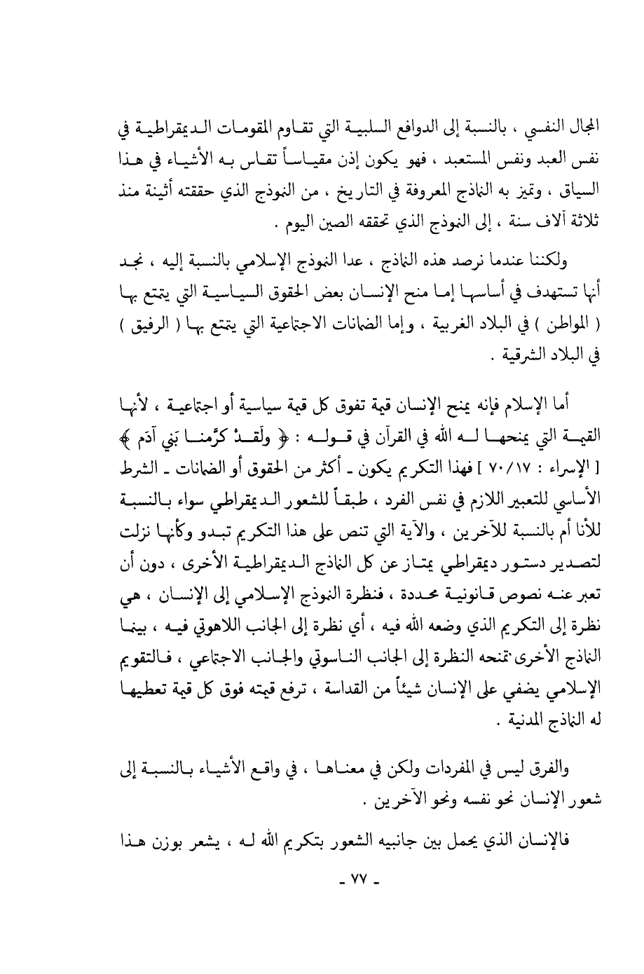 أما الإسلام فإنه يمنح الإنسان قيمة تفوق كل قيمة سياسية أو اجتماعية، لأنها القيمة التي يمنحها له الله في القرآن في قوله: (ولَقدْ كرَّمنا بَني آدَم! أالإساء: 17/ 170 فهذا التكريم يكون- أ! ثر من الحقوق أو الفمانات- الشرط الاساسي للتعبير اللازم في نفس الفرد، طبقاً للشعور الديمقراطي سواء بالنسبة للأنا أم بالنسبة للآخرين، والآية التي تنص على هذا التكريم تبدو وكأنها نزلت لتصدير دستور ديمقراطي يمتاز عن كل الماذج الديمقراطية الأخرى، دون أن تعبر عنه نصوص قانونية محددة، فنظرة النموذج الإسلامي إلى الإنسان، هي نظرة إلى التكريم الذي وضعه الله فيه، أي نظرة إلى الجانب اللاهوتي فيه، بينها الاذج الأخرى! تمنحه النظرة إلى الجانب الناسوتي والجانب الاجتماعي، فالتقو يم الإسلامي يضفي على الإنسان شيئاً من القداسة، ترفع قيمته فوق كل قيمة تعطيها له النماذج الدنية.