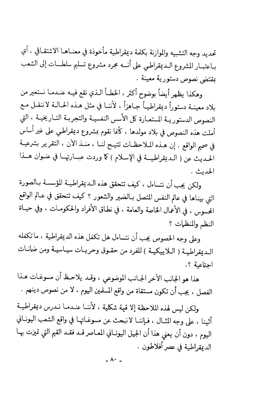 بلاد معينة دستوراً ديمقراطياً جاهزاً، لأننا في مثل هذه الحالة لأننقل مع النصوص الدستورية الستعارة كل الاسس النفسية والتجربة التاريخية، التي أملت هذه النصوص في بلاد مولدها، كانما نقوم بمتنروع ديمقراطي على غير أساس في صيم الواقع. إن هذه الملاحظات تتيح لنا، منذ الآن، التقرير بشرعية الحديث عن (الديمقراطية في الإسلام)؟ وردت عبارتها في عنوان هذا الحديث.