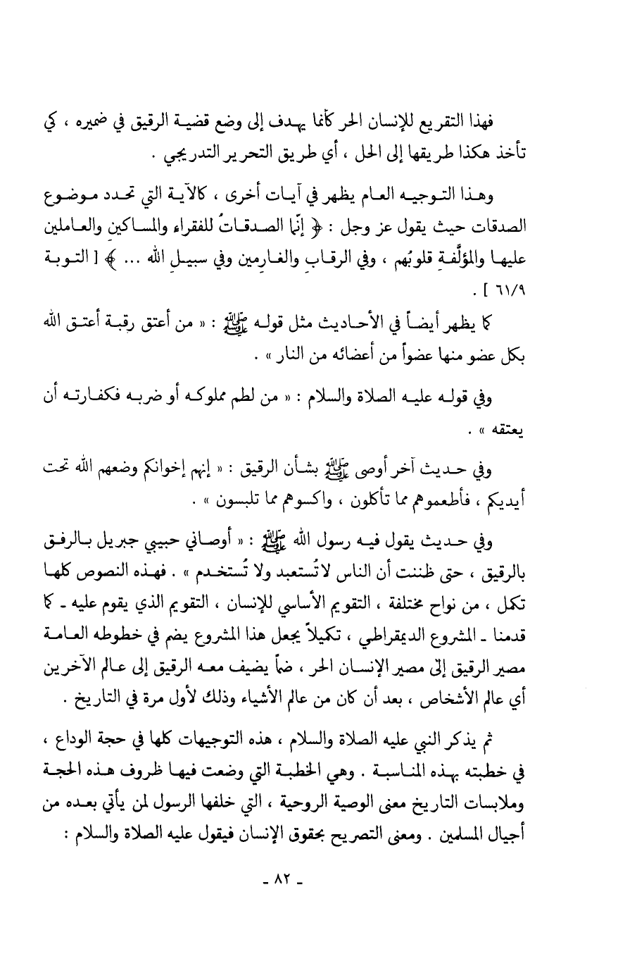 وفي حديث يقول فيه رسول الله!: ((أوصافي حبيي جبريل بالرفق بالرقيق، حتى ظننت أن الناس لاتُستعبد ولا تستخدم ". فهذه النصوص كلها تكل، من نواح مختلفة، التقويم الاساسي للإنسان، التقو يم الذي يقوم عليه-؟ قدمنا- الشروع الديمقراطي، تكيلاً يجعل هذا المشروع يفم في خطوطه العأمة مصير الرقيق إلى مصير الإنسان الحر، ضأ يضيف معه الرقيق إلى عا! الآخرين أي عا االأشخاص، بعد أن كان من عالم الأشياء وذلك لاول مرة في التاريخ.