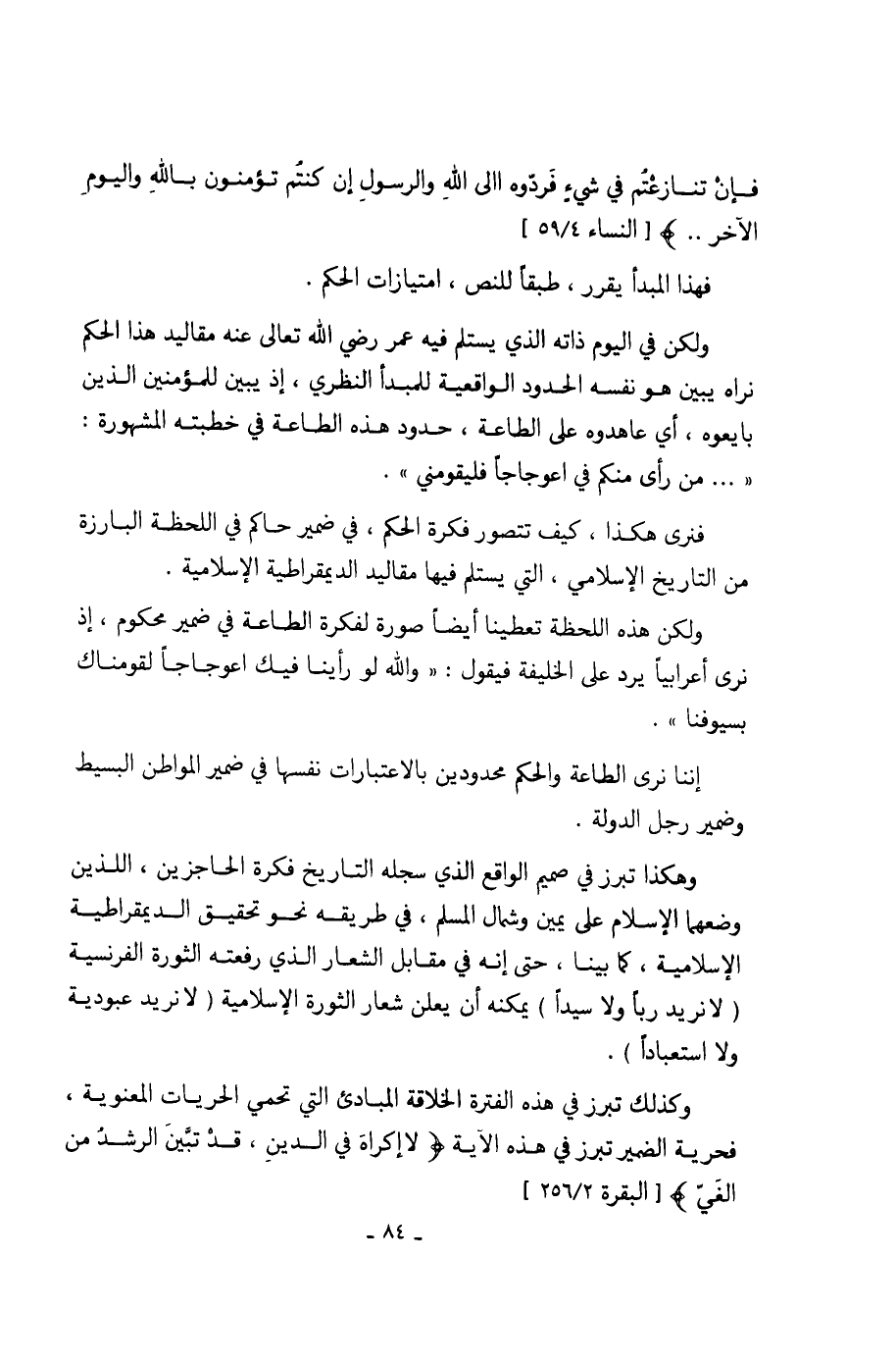 نراه يبين هو نفسه الحدود الواقعية ل! بدأ النظري، إذ يبين ل! ؤمنين الذين بايعوه، أي عاهدوه على الطاعة، حدود هذه الطاعة في خطبته الشهورة: " ... من رأى منم في اعوجاجا فليقومني ".