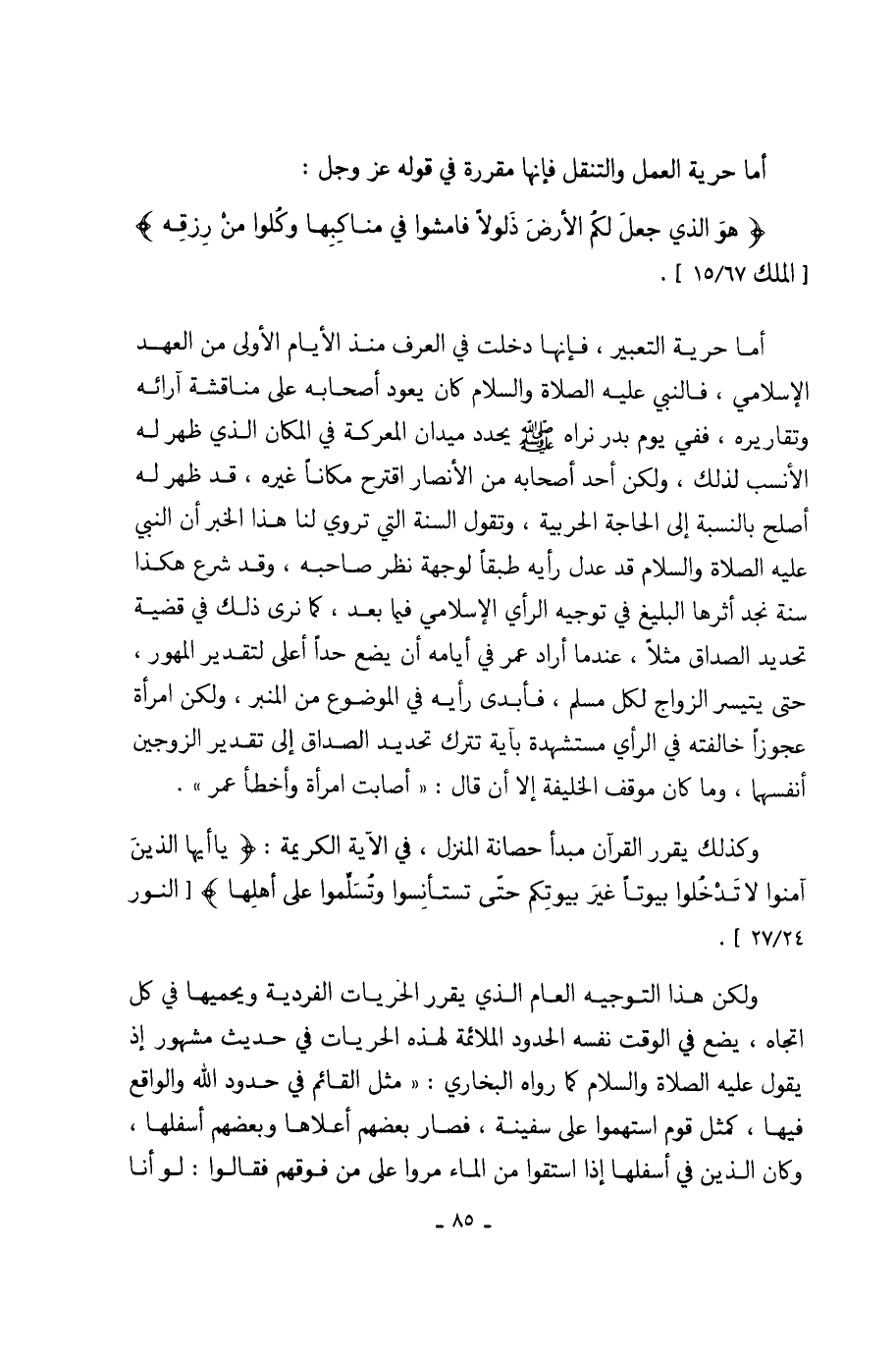 أما حرية التعبير، فإنها دخلت في العرف منذ الأيام الأولى من العهد الإسلامي، فالني عليه الصلاة والسلام كان يعود أصحابه على مناقشة آرائه وتقاريره، ففي يوم بدر نراه! ين! ر يحدد ميدان العركة في ال! ن الذي ظهر له الأنسب لذلك، ولكن أحد أصحابه من الأنصار اقترح م! نأ غيره، قد ظهر له أصلح بالنسبة إلى الحاجة اطربية، وتقول السنة التي تروي لنا هذا الخبر أن الني عليه الصلاة والسلام قد عدل رأيه طبقاً لوجهة نظر صاحبه، وقد كثرع هكذا سنة نجد أثرها البليغ في توجيه الرأي الإسلامي فيها بعد، كانرى ذلك في قضية تحديد الصداق مثلا، عندما أراد عر في أيامه أن يضع حداً أعلى لتقدير الهور، حتى يتشر الزواج لكل مسم، فأبدى رأيه في الموضوع من النبر، ولكن امرأة عجوزاً خالفته في الرأي مستشهدة بآية تترك تحديد الصداق إلى تقدير الزوجين أنفس! ما، وما كان موقف الخليفة إلا أن قال: " أصابت امرأة وأخطأ ممر ". وكذلك يقرر القرآن مبدأ حصانة النزلط، في الاَية الكريمة: (يا أيها الذينَ
