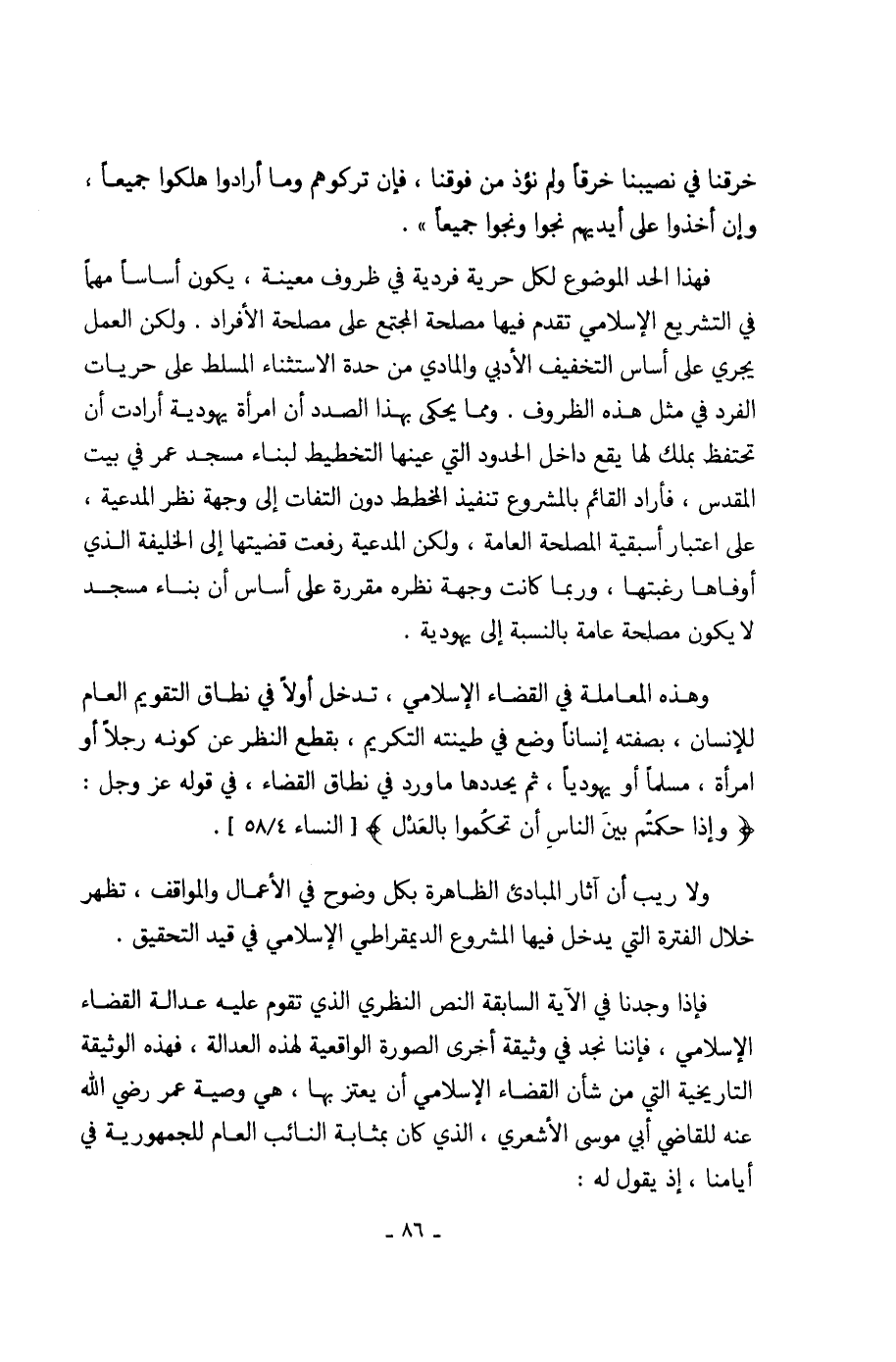 ولا ريب أن آثار البادئ الظاهرة بكل وضوح في الاممال والمواقف، تظهر خلال الفترة التي يدخل فيها الشروع الديمقراطي الإسلامي في قيد التحقيق. فإذا وجدنا في الآية السابقة النص النظري الذي تقوم عليه عدالة القضاء الإسلامي، فإننا نجد في وثيقة أنجرى الصورة الواقعية لهذه العدالة، فهذه الوثيقة التاريخية التي من شأن القضاء الإسلامي أن يعتز بها، هي وصية عر رضي اللْه عنه للقاضي أل! موصى الاشعري، الذي كان بمثابة النائب العام للجمهورية في أيامنا، إذ يقول له: