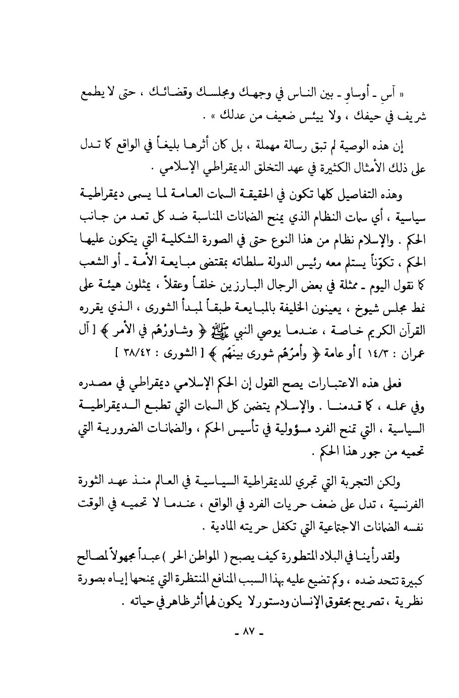 وفي عله، كما قدمنا. والإسلام يت! بهن كل السماتا التي تطبع الديمقراطية السياسية، التي تمنح الفرد مسؤولية في تأسيس اطم، والضانات الضرورية التي تحميه من جورهذا الحم.