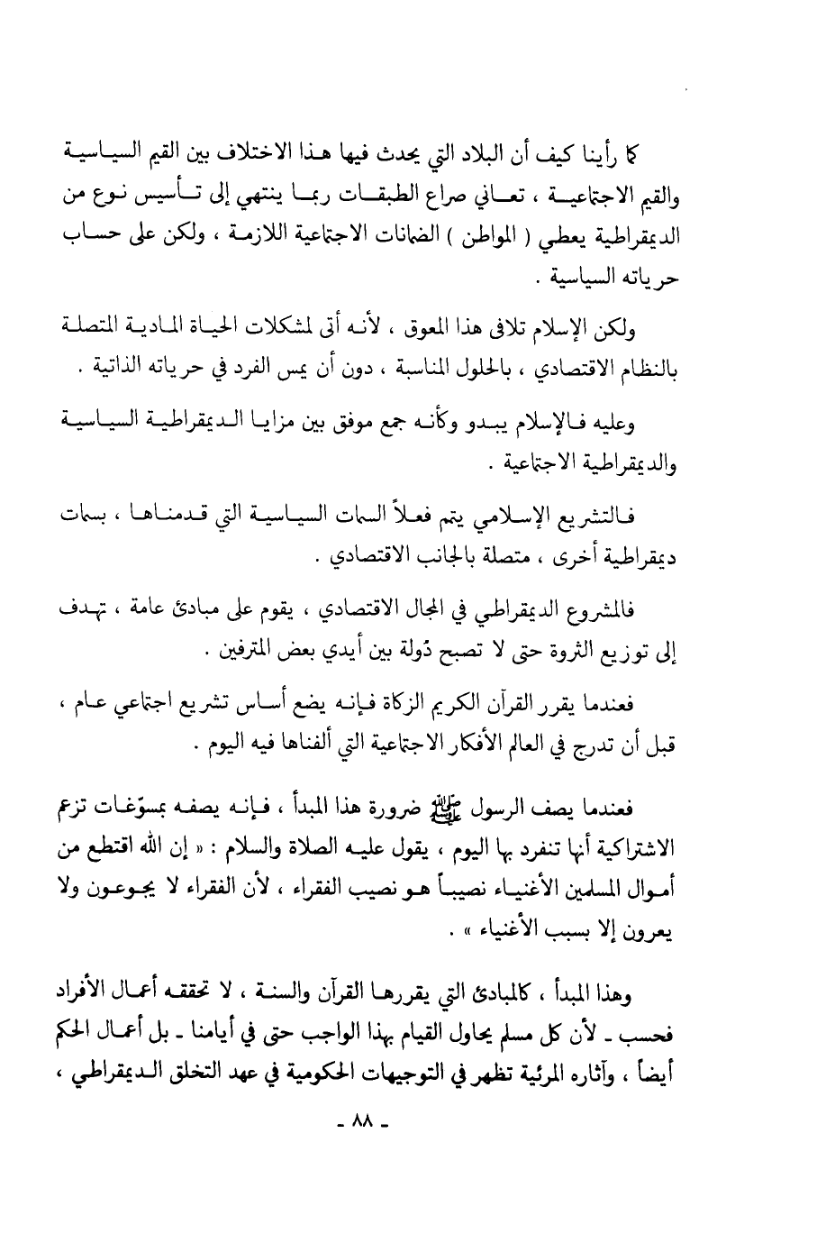 ولكن الإسلام تلافى هذا العوق، لأنه أقى لمشكلات الحياة الادية التصلة بالنظام الإقتصادي، بالحلولط الناسبة، دون أن يمس الفرد في حرياته الذاتية. وعليه فالإسلام يبدو وكانه جمع موفق بين مزايا الديمقراط! ية السياسية