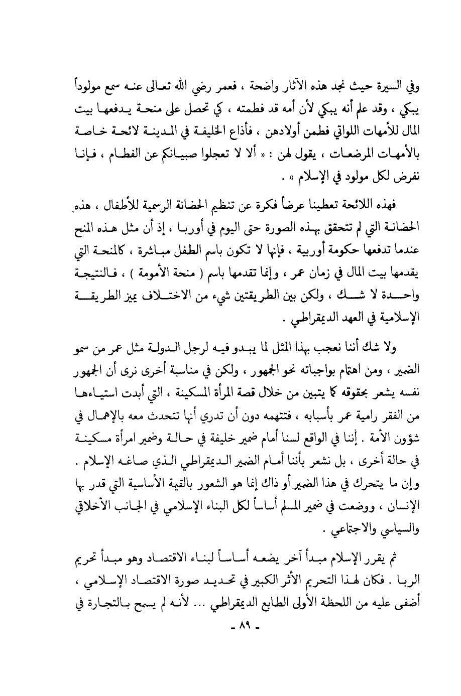 فهذه اللائحة تعطينا عرضا فكرة عن تنظيم اطضانة الرحمية للاطفال، هذه الحضانة التي اتتحقق بهذه الصورة حتى اليوم في أوربا، إذ أن مثل هذه النح عندما تدفعها حكومة أوربية، فإخها لا تكون باسم الطفل مباشرة، كما لنحة التي يقدمها بيت الال في زمان عر، وإنما تقدمها باصم (منحة الامومة)، فالنتيجة واحدة لا شك، ولكن بين الطريقتين شيء من الاختلاف يميز الطريقة الإسلامية في العهد الديمقراطي.