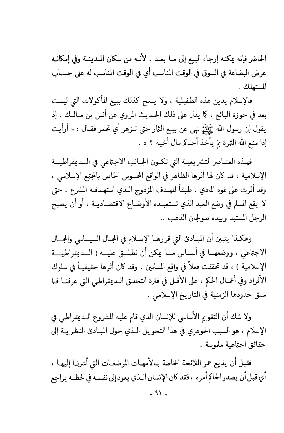 ولا شك أن التقو يم الاساسي للإنسان الذي قام عليه الشروع الديمقراطي في الإسلام، هو السبب الجوهري في هذا التحو يل الذي حول البادئ النظرية إلى حقائق اجتماعية م! وسة.