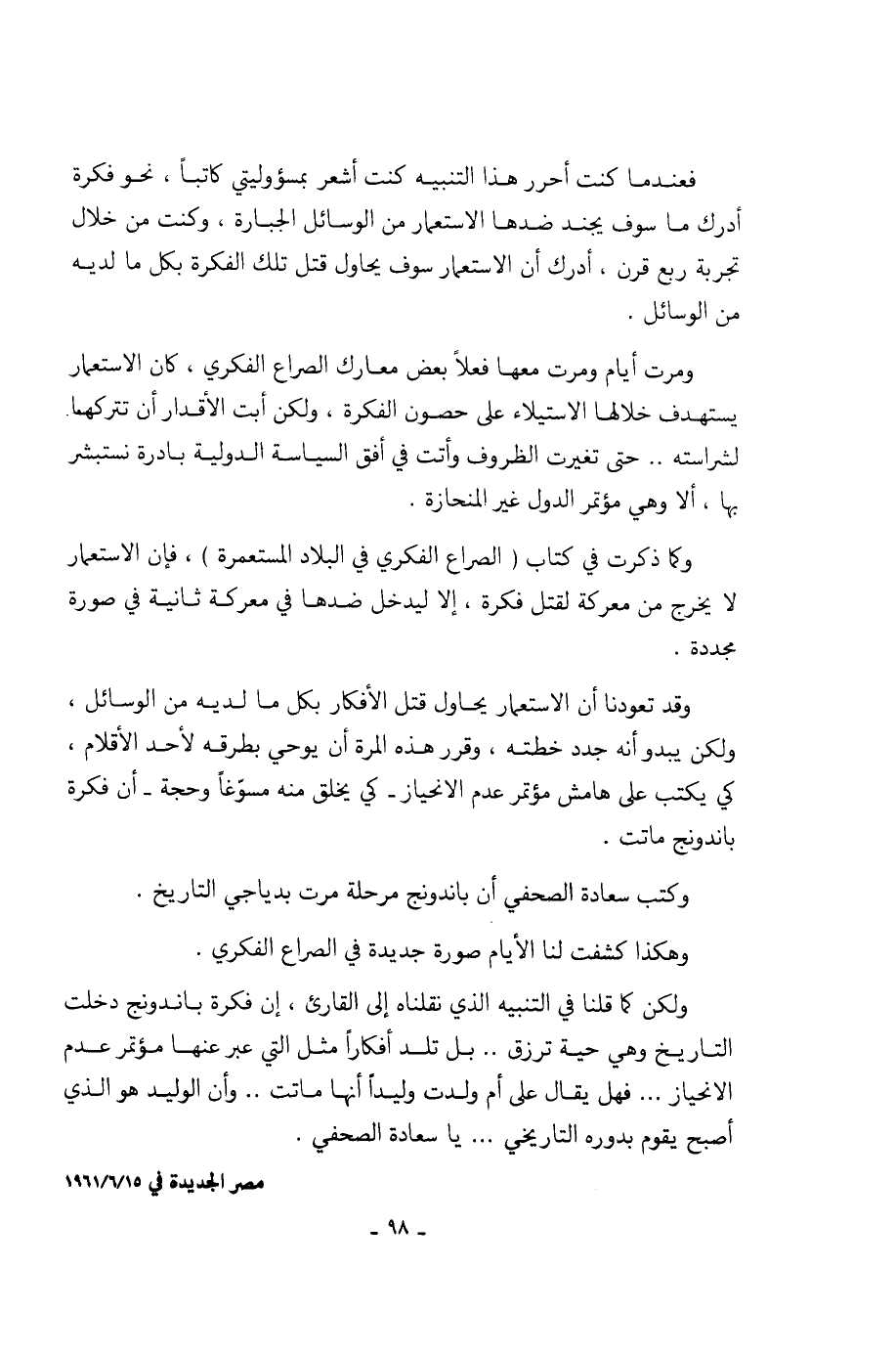 ولكن كما قلنا في التنبيه الذي نقلناه إلى القارئ، إن فكرة باندونج دخلت التاريخ وهي حية ترزق .. بل تلد أفكاراً مثل التي عبر عنها مؤتمر عدم الإنحياز ... فهل يقال على أم ولدت وليدا أنها ماتت .. وأن الوليد هو الذي أصبح يقوم بدوره التاريخي ... يا سعادة الصحفي.