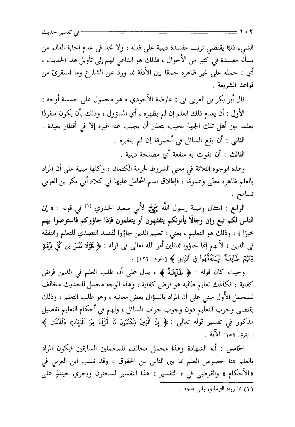 وهذه الوجوه الثلاثة في معنى الشروط لحرمة الكتمان، وكلها مبنية على أن المراد بالعلم ظاهره معنى وعمومًا، فإطلاق اسم المحامل عليها في كلام أبي بكر بن العربي تسامح.