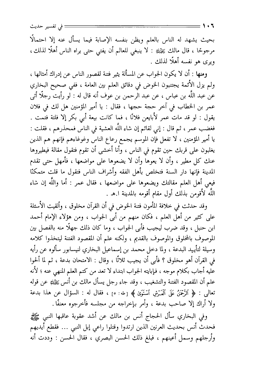 وقد حدثت في خلافة المأمون فتنة الخوض في أن القرآن مخلوق، وألقيت الأسئلة على كثير من أهل العلم، فكان منهم من أبي الجواب، ومن هؤلاء الإمام أحمد ابن حنبل، وقد ضرب ليجيب فأبى الجواب، وما كان ذلك جهلاً منه بالفصل بين الموصوف بالمخلوق والموصوف بالقديم، ولكنه علم أن المقصود الفتنة ليتخذوا كلامه وسيلة لتأييد البدعة، ولما دخل محمد بن إسماعيل البخاري لنيسابور سألوه عن رأيه في القرآن أهو مخلوق؟ فأبى أن يجيب ثلاثًا، وقال: الامتحان بدعة، ثم لما ألحوا عليه أجاب بكلام موجه، فإبايته الجواب ابتداء لا تعد من كتم العلم المنهي عنه؛ لأنه علم أن المقصود الفتنة والتشغيب، وقد جاء رجل يسأل مالك بن أنس رحمه الله عن قوله تعالى: {الرَّحْمَنُ عَلَى الْعَرْشِ اسْتَوَى (5)} [طه: 5]، فقال له: السؤال عن هذا بدعة ولا أراك إلا صاحب بدعة، وأمر بإخراجه من مجلسه فأخرجوه معنفًا.