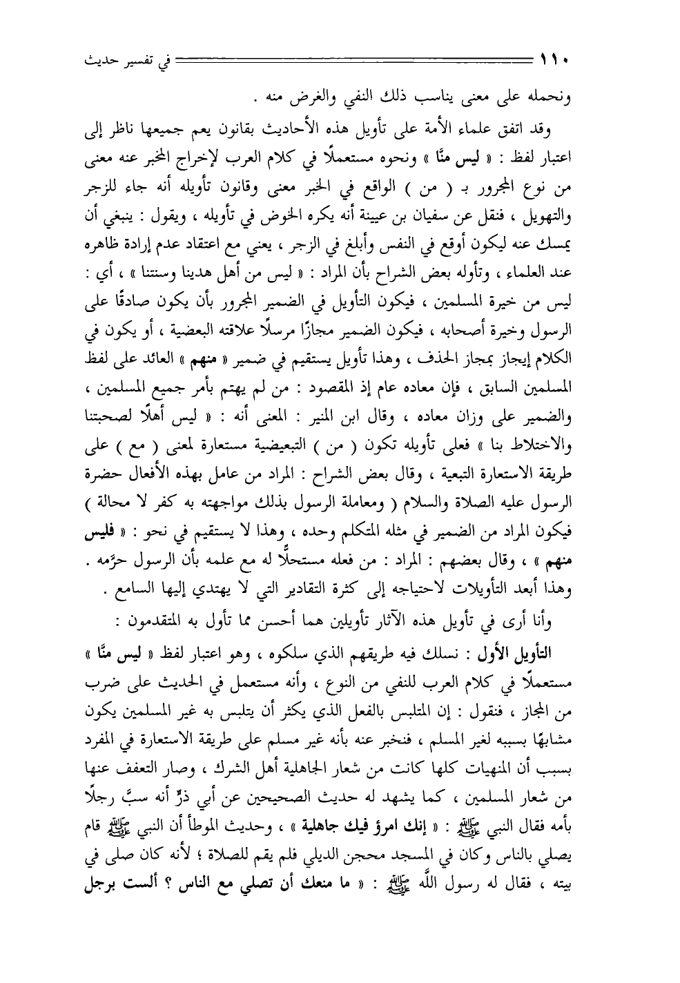 التأويل الأول: نسلك فيه طريقهم الذي سلكوه، وهو اعتبار لفظ «ليس منا» مستعملاً في كلام العرب للنفي من النوع، وأنه مستعمل في الحديث على ضرب من المجاز، فنقول: إن المتلبس بالفعل الذي يكثر أن يتلبس به غير المسلمين يكون مشابهًا بسببه لغير المسلم، فنخبر عنه بأنه غير مسلم على طريقة الاستعارة في المفرد بسبب أن المنهيات كلها كانت من شعار الجاهلية أهل الشرك، وصار التعفف عنها من شعار المسلمين، كما يشهد له حديث الصحيحين عن أبي ذر أنه سب رجلاً بأمه فقال النبي - صلى الله عليه وسلم -: «إنك امرؤ فيك جاهلية»، وحديث الموطأ أن النبي - صلى الله عليه وسلم - قام يصلي بالناس وكان في المسجد محجن الديلي فلم يقم للصلاة؛ لأنه كان صلى في بيته، فقال له رسول الله - صلى الله عليه وسلم -: «ما منعك أن تصلي مع الناس؟ » ألست برجل