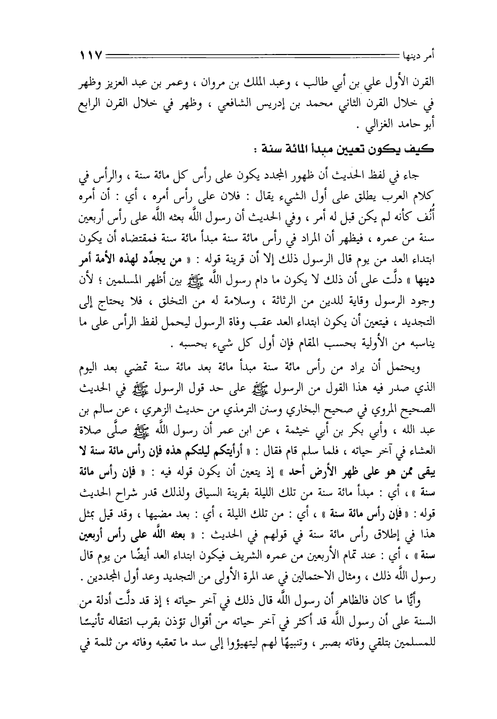 جاء في لفظ الحديث أن ظهور المجدد يكون على رأس كل مائة سنة، والرأس في كلام العرب يطلق على أول الشيء يقال: فلان على رأس أمره، أي: أن أمره أنف كأنه لم يكن قبل له أمر، وفي الحديث أن رسول الله بعثه الله على رأس أربعين سنة من عمره، فيظهر أن المراد في رأس سنة مبدأ سنة فمقتضاه أن يكون ابتداء العد من يوم قال الرسول ذلك إلا أن قرينة قوله: «من يجدد لهذه الأمة أمر دينها» دلت على أن ذلك لا يكون ما دام رسول الله - صلى الله عليه وسلم - بين أظهر المسلمين؛ لأن وجود الرسول وقاية للدين من الرثاثة، وسلامة له من التخلق، فلا يحتاج إلى التجديد، فيتعين أن يكون ابتداء العد عقب وفاة الرسول ليحمل لفظ الرأس على ما يناسبه من الأولية بحسب المقام فإن أول كل شيء بحسبه.