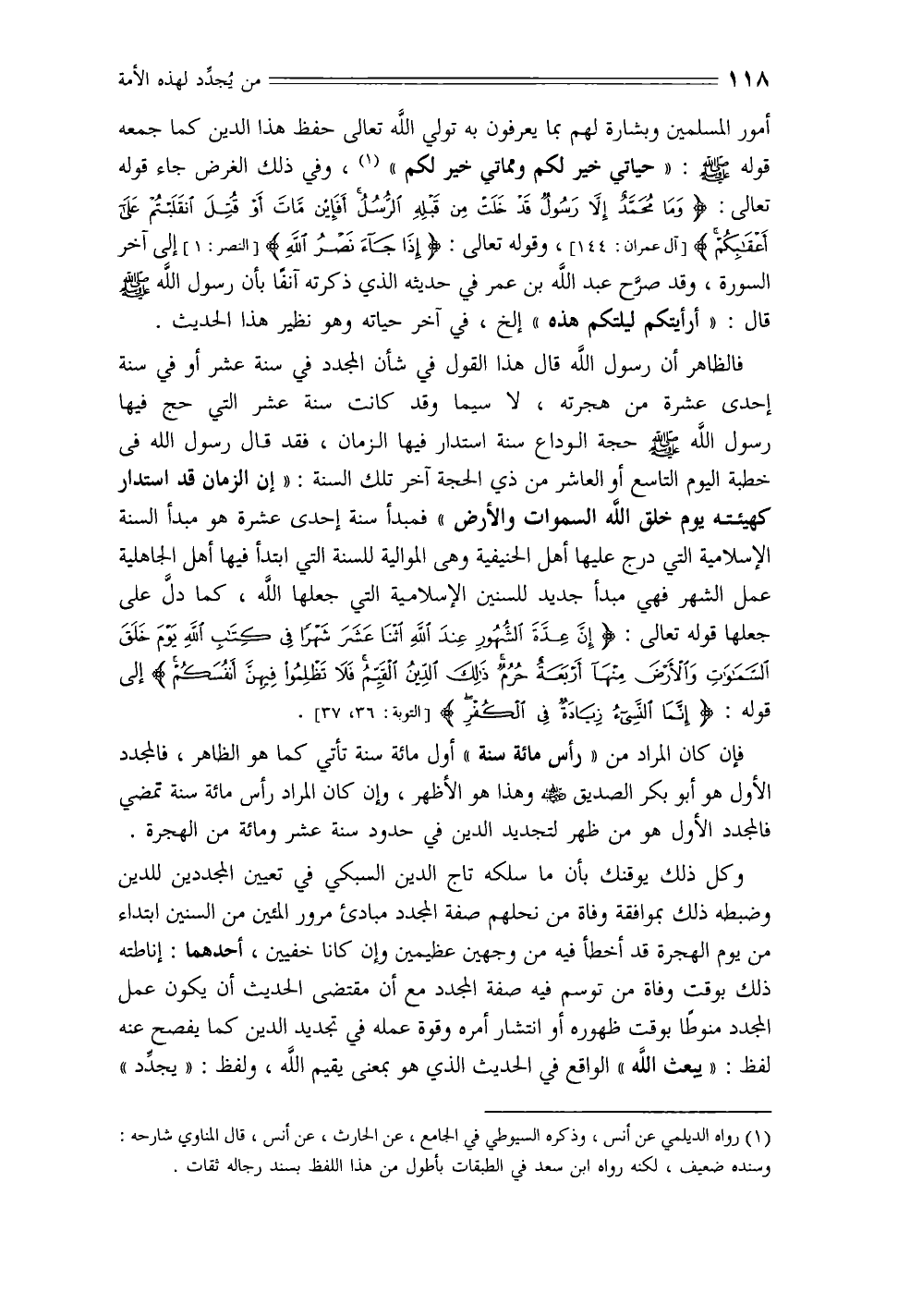 فالظاهر أن رسول الله قال هذا القول في شأن المجدد في سنة عشر أو في سنة إحدى عشرة من هجرته، لا سيما وقد كانت سنة عشر التي حج فيها رسول الله - صلى الله عليه وسلم - حجة الوداع سنة استدار فيها الزمان، فقد قال رسول الله في خطبة اليوم التاسع أو العاشر من ذي الحجة آخر تلك السنة: «إن الزمان قد استدار كهيئته يوم خلق الله السموات والأرض» فمبدأ سنة إحدى عشرة هو مبدأ السنة الإسلامية التي درج عليها أهل الحنيفية وهي الموالية للسنة التي ابتدأ فيها أهل الجاهلية عمل الشهر فهي مبدأ جديد للسنين الإسلامية التي جعلها الله، كما دل على جعلها قوله تعالى: {إِنَّ عِدَّةَ الشُّهُورِ عِنْدَ اللَّهِ اثْنَا عَشَرَ شَهْرًا فِي كِتَابِ اللَّهِ يَوْمَ خَلَقَ السَّمَاوَاتِ وَالْأَرْضَ مِنْهَا أَرْبَعَةٌ حُرُمٌ ذَلِكَ الدِّينُ الْقَيِّمُ فَلَا تَظْلِمُوا فِيهِنَّ أَنْفُسَكُمْ} إلى قوله: {إِنَّمَا النَّسِيءُ زِيَادَةٌ فِي الْكُفْرِ} [التوبة: 36، 37].