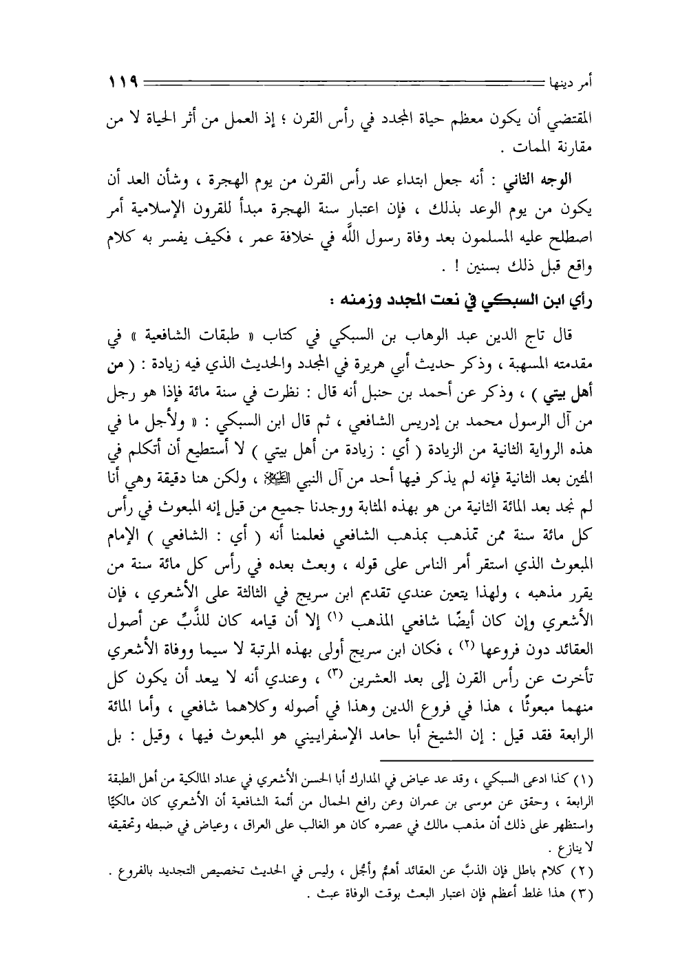 رأي ابن السبكي في نعت المجدد وزمنه: