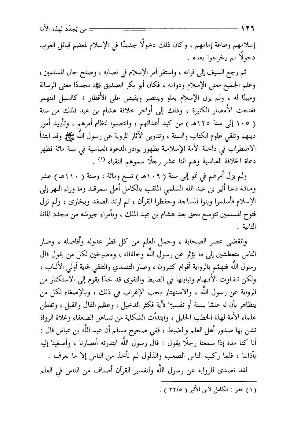 ثم رجع السيف إلى قرابه، واستقر أمر الإسلام في نصابه، وصلح حال المسلمين، وعلم الجميع معنى الإسلام ودوامه، فكان أبو بكر الصديق - رضي الله عنه - مجددًا معنى الرسالة ومبينًا له، ولم يزل الإسلام يعلو وينتصر ويفيض على الأقطار؛ كالسيل المنهمر ففتحت الأمصار الكثيرة، وذلك إلى أواخر خلافة هشام بن عبد الملك من سنة (105 إلى سنة 125 هـ) من كيد أعدائهم، وانتصبوا لنظام أمرهم، وتأييد أمور دينهم وتلقي علوم الكتاب والسنة، وتدوين الآثار المروية عن رسول الله - صلى الله عليه وسلم - وقد ابتدأ الاضطراب في داخلة الأمة الإسلامية بظهور بوادر الدعوة العباسية في سنة مائة فظهر دعاة الخلافة العباسية وهم اثنا عشر رجلاً سموهم النقباء.