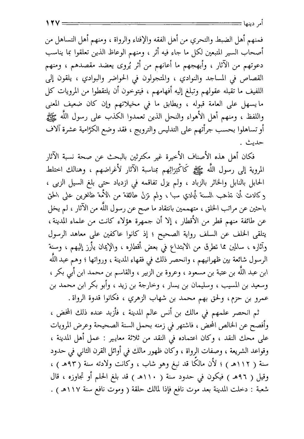 فكان أهل هذه الأصناف الأخيرة غير مكترثين بالبحث عن صحة نسبة الآثار المروية إلى رسول الله - صلى الله عليه وسلم - كاكتراثهم بمناسبة الآثار لأغراضهم، وهنالك اختلط الحابل بالنابل والخاثر بالزباد، ولم يزل تفاقمه في ازدياد حتى بلغ السيل الزبى، وكادت أن تذهب السنة أيادي سبا، ولم تزل طائفة من الأمة ظاهرين على الحق باحثين عن مراتب الخلق، متهممين بانتقاد ما صح عن رسول الله من الآثار، لم يخل عن طائفة منهم قطر من الأقطار، إلا أن جمهرة هؤلاء كانت من علماء المدينة، يتلقى الخلف عن السلف رواية الصحيح؛ إذ كانوا عاكفين على معاهد الرسول وآثاره، سالمين مما تطرق من الابتداع في بعض أقطاره، والإيمان يأرز إليهم، وسنة الرسول شائعة بين ظهرانيهم، وانحصر ذلك في فقهاء المدينة، ورواتها؛ وهم عبد الله ابن عبد الله بن عتبة بن مسعود، وعروة بن الزبير، والقاسم بن محمد ابن أبي بكر، وسعيد بن المسيب، وسليمان بن يسار، وخارجة بن زيد، وأبو بكر ابن محمد بن عمرو بن حزم، ولحق بهم محمد بن شهاب الزهري، فكانوا قدوة الرواة.
